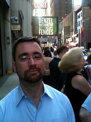 July 2 – Seeing the revival of August Wilson’s Fences at the Cort Theatre – where the audience has to line up down the block, that traditional way of signifying “blockbuster hit” – reminded me that I was present for the very first public presentation of the play, at the O’Neill Conference in the summer of…1986? It’s still the same play as it was then: a somewhat long and rambling backyard play with lots of realistic two-black-guys-shooting-the-shit dialogue, chaotic-household action, a little too heavy leaning on the baseball metaphors, and the kind of choppy second-act wrapping-things-up sequence of events that bespeak “novice playwright.” Plus an awkward last-minute leap into non-naturalism, which would show up again in other plays (like Joe Turner’s Come and Gone). Wilson wrote much better, less derivative plays later. I didn’t love the first Broadway production, with Lloyd Richards’ leaden direction and James Earl Jones’ ponderous performance as Troy Maxson, the would-be ballplayer turned bitter garbageman, brightened by the spectacular Mary Alice as Rose. The new production directed by Kenny Leon is much better, partly thanks to the high-voltage cast: Denzel Washington of course, with Viola Davis, Stephen McKinley Henderson, and Russel Hornsby. (Chris Chalk was fine as Cory, the Biff Loman-like son, but Courtney Vance was better in the original production.)