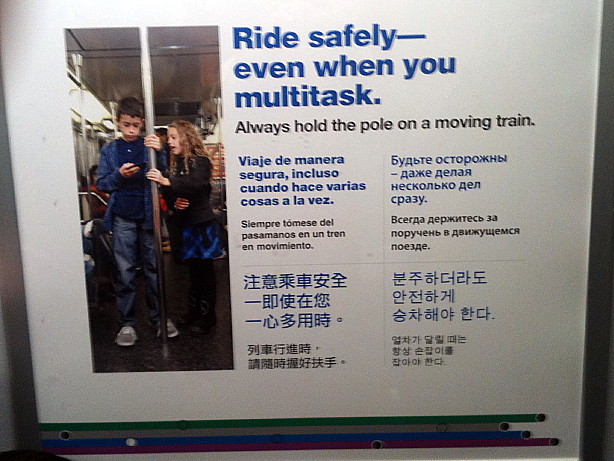 thanks to New York City subway signage, you too can learn to say "multitask" in Russian and Korean