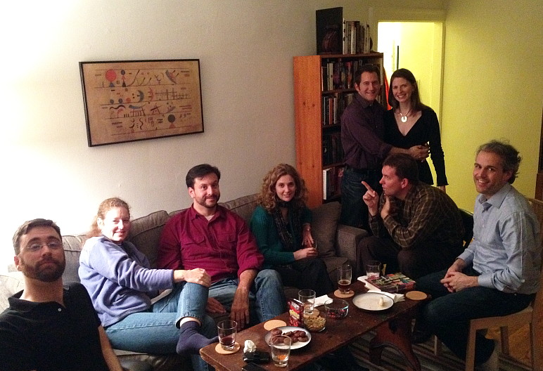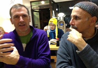 Dinner at Cha-Ya in the Mission with Keith Hennessy, Andrew Ramer, and a guy wearing a Big Bird winter hat