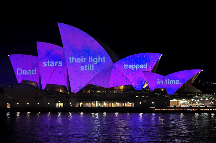 I just stumbled upon a beautiful slideshow online of Laurie Anderson’s 2010 “Lighting the Sails,” an installation of images projected onto the Sydney Opera House. The documentary photographs are by Mei Li. Check it out here.