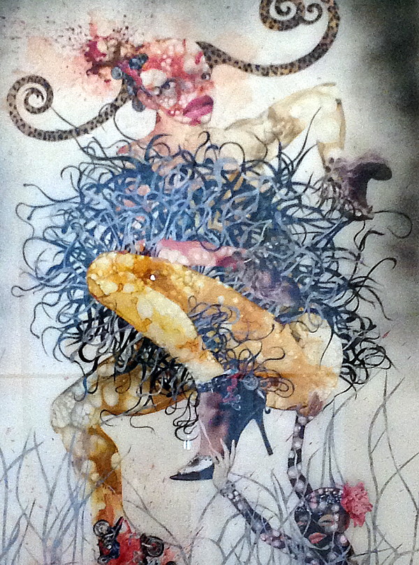 These smartphone pix of Paul Wunderlich’s delicate drawing “Chair Man” (above) and Kenyan artist Wangenchi Mutu’s multimedia piece “One Hundred Lavish Months of Bushwhack” (below), which hangs right outside the “Exquisite Corpse” show, don’t do them justice — worth checking out in person.