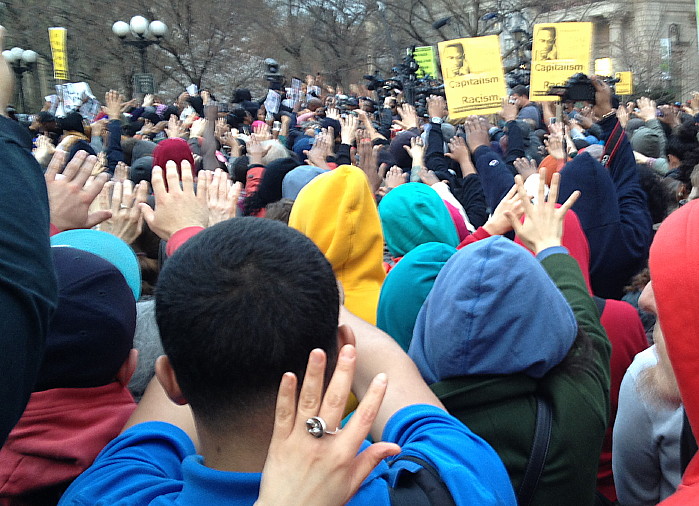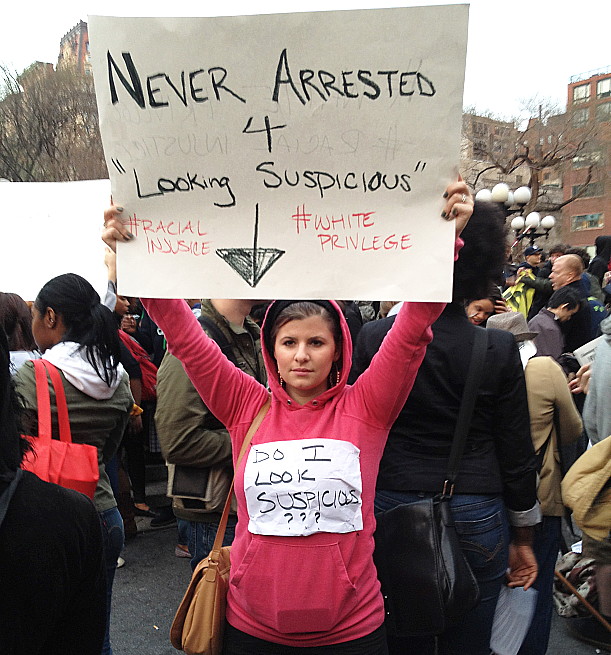One of the other speakers enumerated some of the outrageous facts of the case — that the police who arrived at the scene ran a background check on the victim, not on the shooter, and ran a drug-and-alcohol test on the victim, not on the shooter. If the victim had been white and the shooter had been black, would the police have questioned the killer for an hour and then let him go home? That was one of a string of rhetorical questions the speaker posed to the crowd. Another, alluding to Sanford Police Chief Bill Lee, was “What do you do when your employer won’t do his job?” Someone yelled out, “Execute him!” which caused the people around me to both gasp and chuckle in disbelief. The woman standing next to me and I exchanged bemused looks. “Wrong answer,” she said.