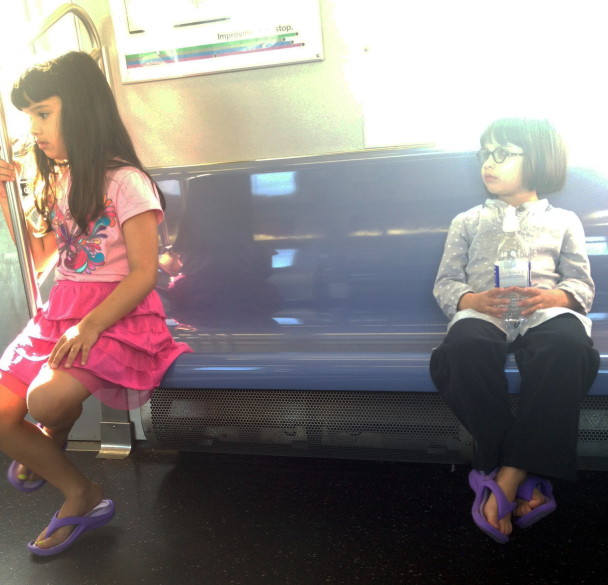 we headed back into Manhattan — on the subway these little girls were riveted by the sight of a homeless man sprawled sleeping on an entire row of seating (while everybody else studiously avoided him)