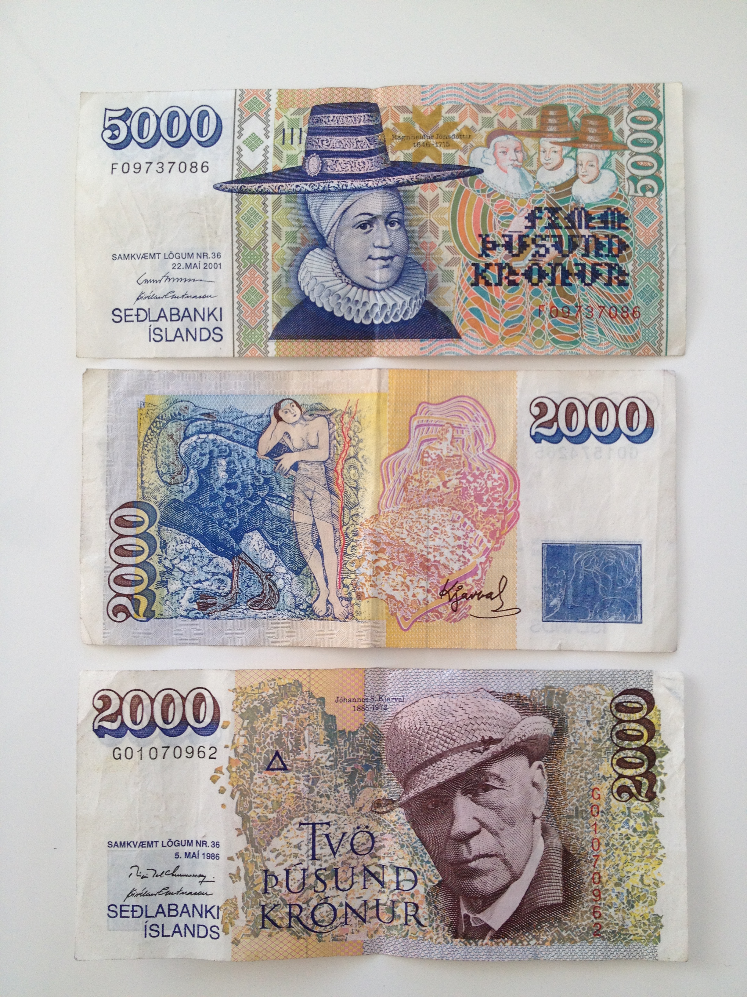 After the redeye flight lands at Keflavik Airport, you take the Flybus into Reykjavik. One of my first stops was the bank to exchange money. It’s not strictly necessary — you can spend your whole time in Iceland without handling cash, but I like seeing different currencies, and Iceland’s is pretty cool. Check out the unusual graphics, not to mention the huge denominations, reminiscent of Italian lira. 1000 kroner is about $8.