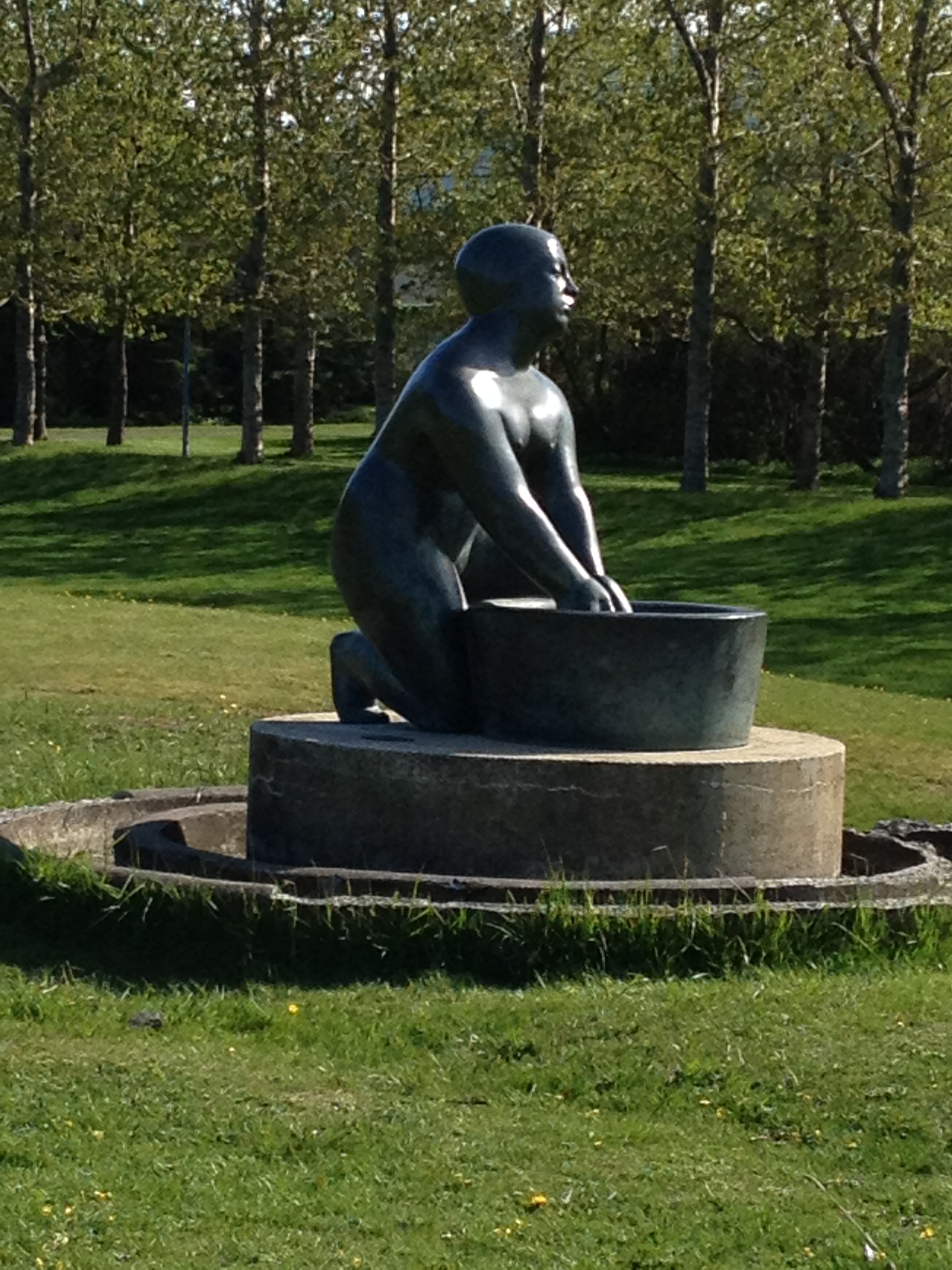 We checked out Laugurdalur, the large sports center where Andy would be spending most of the week competing in an aquatics championship. The adjacent botanical garden features several outdoor sculptures, including this striking “Washerwoman” by Asmundur Sveinsson, a tribute to the nearby Old Wash House where the city’s laundry used to be done.
