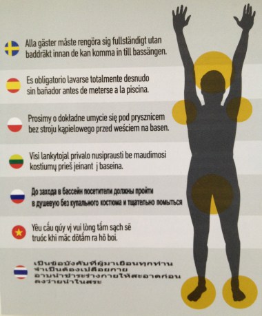After a lot of walking and bicycling, it made the most sense to observe the daily local custom of soaking in a “hot pot.” The public pool nearest where we’re staying had hot tubs of two temperatures on the roof. Public baths being a crucial aspect of Icelandic culture, it is imperative to shower beforehand. The protocol demands showering without swimsuits, and the signage makes very clear which parts they want to wash thoroughly.