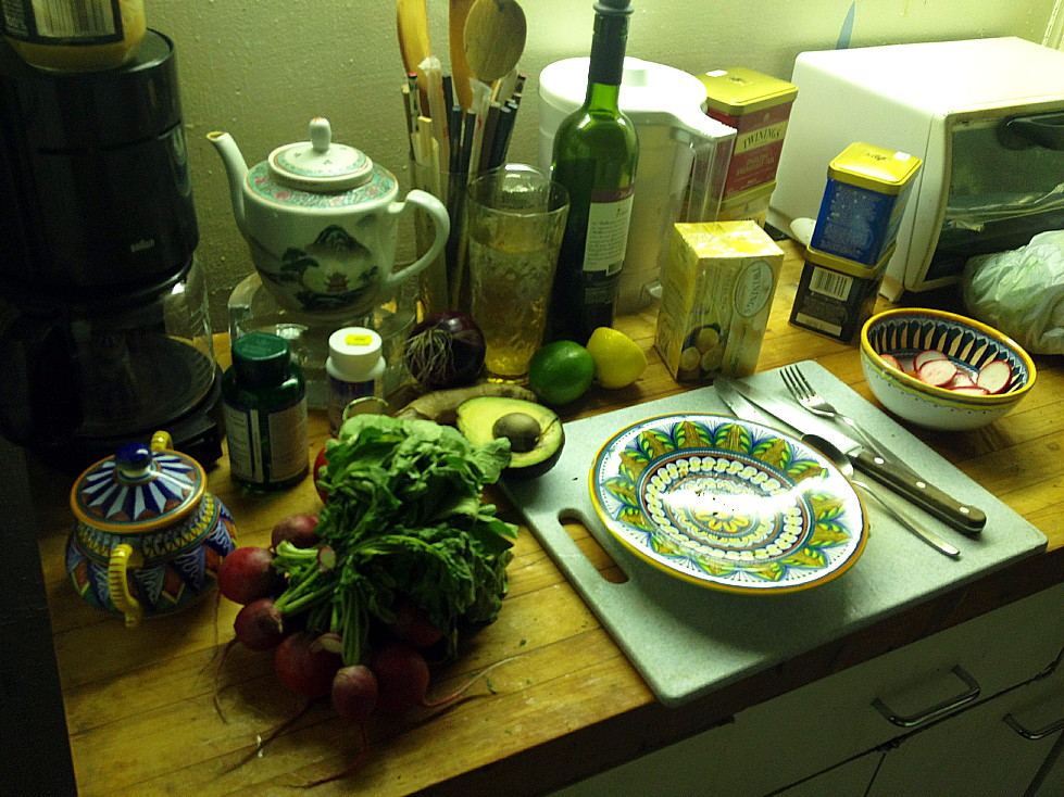 “Kitchen Counter with Toaster Oven, Fish Oil Capsules, and Sliced Radishes in Hand-Painted Sienese Bowl” — the painting Rembrandt forgot to paint