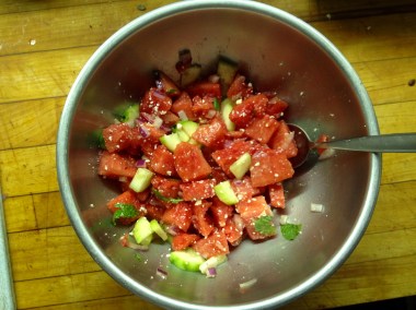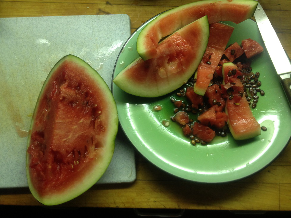 I think I can definitively say this is the seediest fucking watermelon I’ve seen in my life. It’s like the karmic watermelon, containing all the seeds that were genetically removed from other melons I’ve eaten in recent years. I undertook the task of painstakingly de-seeding half of a small spherical melon as a meditative task. I can report that it is an exceedingly tedious job I will never do again, and performing it ran the risk of turning me off from watermelon forever. Just saying.