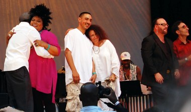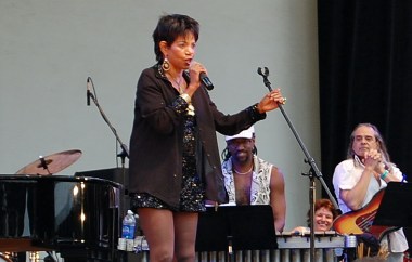 Next up was Melba Moore, not the most obvious choice but apparently she did record some Nyro numbers early on, including “Time and Love,” which she sang here, followed by “Wedding Bell Blues.” Closing the show was someone else we haven’t heard from in a while, Melissa Manchester (below, at the curtain call hugging Gil, who’s just gotten a big lipstick kiss from Sarah Dash) but she did a good job channeling Laura, pounding the piano and singing “Save the Country” and “Stoned Soul Picnic.” On my way out of Damrosch Park, I ran into fellow fanatic Alan Filderman, who noted that the concert stuck pretty much to the upbeat hits and steered away from the slow torchy ballads. We both fondly recalled the memorial concert at the Beacon Theater in 1997, where Sandra Bernhard and Rickie Lee Jones represented that soulful extreme side of Laura Nyro with their renditions of “Lonely Women” and “Been on a Train.” I went home and watched for the first time someone’s shaky hand-held YouTube video of Nyro’s induction into the Rock and Roll Hall of Fame this year. Bette Midler gives a wonderful, touching, heartfelt testimonial to Nyro as a quintessential New York City songwriter: “And she was writing in the 1960s and 1970s, when New York City was a pit. A pit! Way worse than Cleveland ever was! Even if you couldn’t see it, she made you want to live there….”