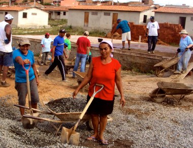 The official name of this build is Projeto Mulheres Recriando Vidas (Women Rebuilding Lives Project), with the goal of constructing 100 new homes to benefit workers at a flour mill in the small town of Feira Nova. We’re here to make house #64-65 (two adjoining houses). Each four-room (2-BR) house is 44 cubic meters. This seems tiny, right? But most of the people currently live in quarters half this size, a two-room house with a dirt floor and no indoor plumbing, for which they pay $50-80R a month. (Although that seems crude and primitive, I can remember as a child visiting my own relatives from large, poor farming families who lived in similar houses in Kansas and Missouri: two rooms, dirt floors, outhouse. The trailers we lived in seemed luxurious by comparison.) For the H4H project, families are expected to work 8 hours a week on the house.