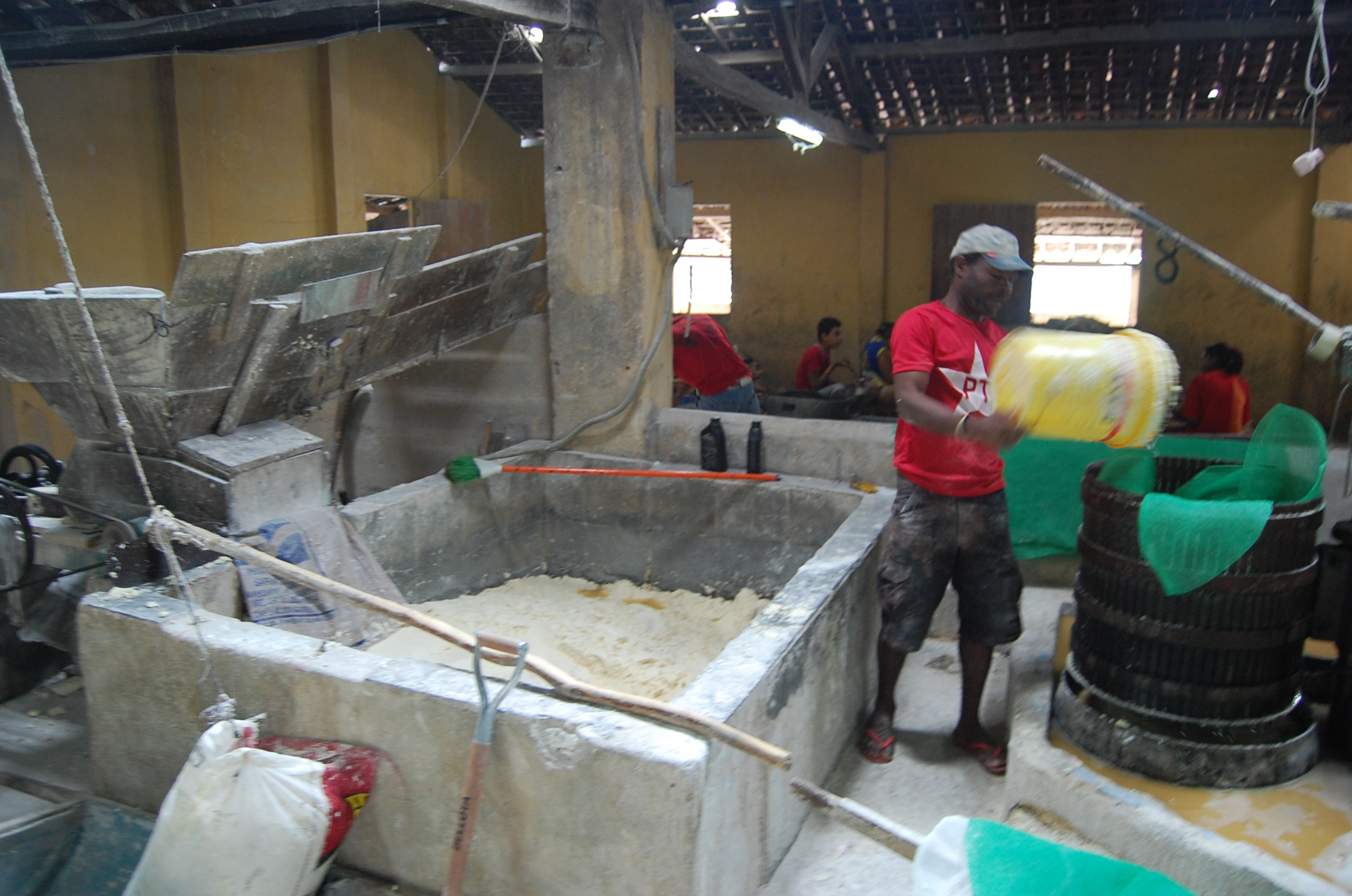 Cassava is a staple of Brazilian diets, and we’ve eaten it in several forms — polenta-like chucks of Generic Starch, consumed with stew, for instance; fried in tiny strips like shoestring potatoes; a millet-like grain served as a garnish sprinkled over virtually anything you might eat. This mill processes cassava in two ways that we might label dry and wet. In this section of the mill, the peeled cassava is shoveled into a chopper that grinds it up, and this guy loads the result into a low-tech system that squeezes the liquid out of it.
