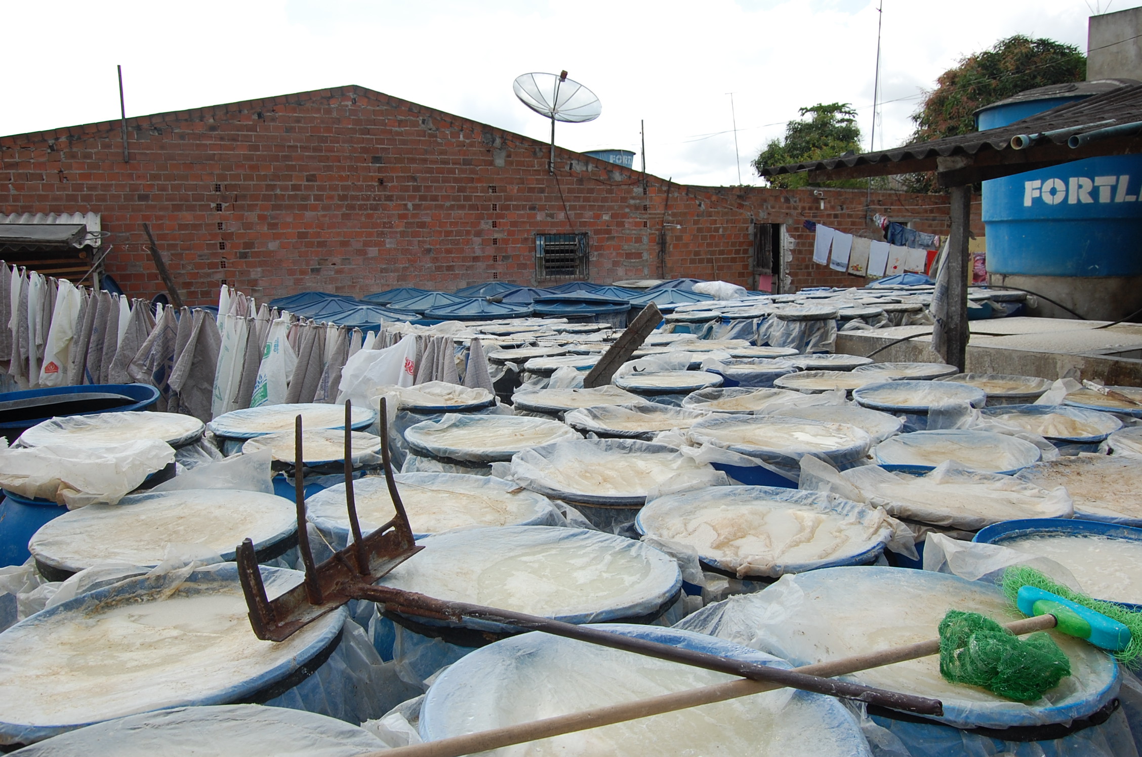 After the liquid has been extracted from them, the remainder gets processed into fine flour used to make cakes and tapioca (a word which to Brazilians means NOT pudding or custard but a quickly fried ingredient-vehicle that’s like a cross between a tortilla and a crepe). One step involves these boys stomping on tied-up bags of mushed up manioc.
