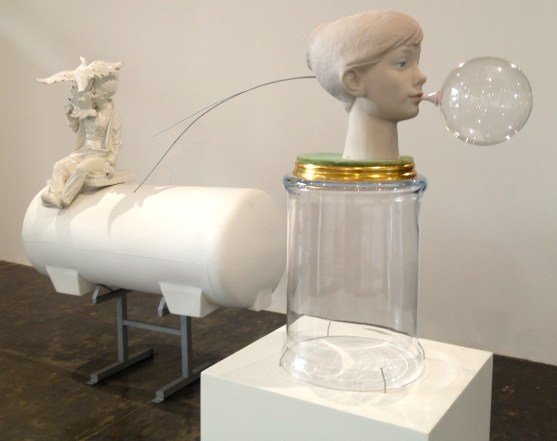 Two sculptures by Greek artist Savvas Christodoulides — (left) “It Was All He Could Do to Keep from Crying” and “I Have Got Something to Say to You (Girl with Bubblegum)”