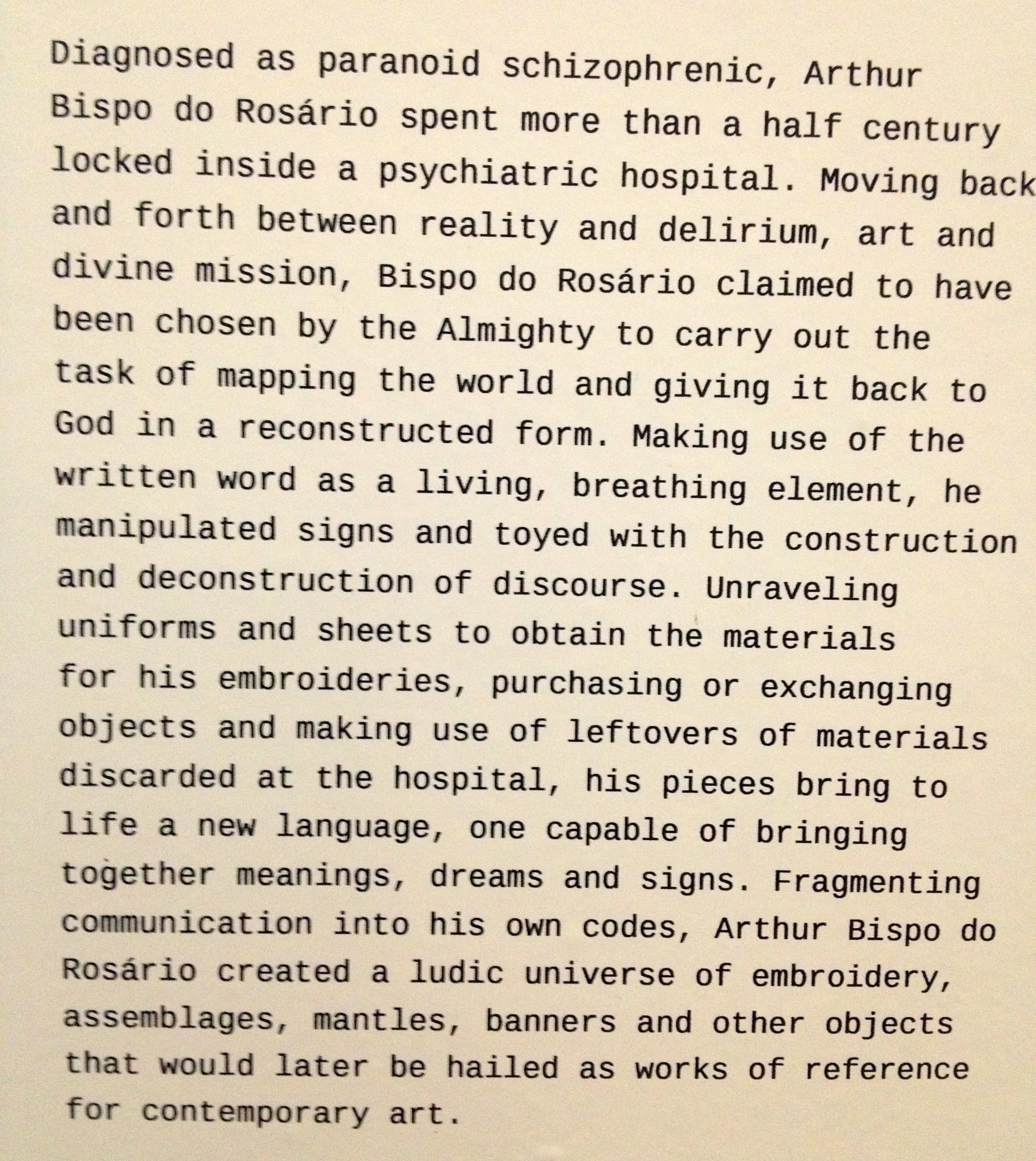 But the major discovery for me was a Brazilian artist named Arthur Bispo do Rosario, who got the largest amount of floor space and number of pieces in the biennial