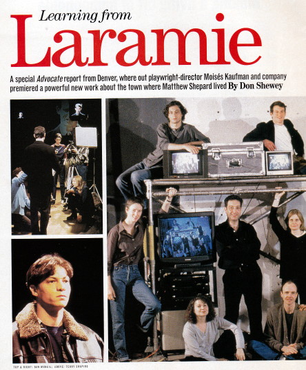 I flew out to Denver in February 2000 for the world premiere of the show at the Denver Center Theatre Company. I interviewed the Tectonic ensemble for an article for The Advocate and made especially warm connections with director Moises Kaufman, writer Leigh Fondakowski, and actor Greg Pierotti. I took my youngest sister to the opening night performance, where we sat next to Zackie Salmon, a Laramie resident portrayed in the show, and met Matt Galloway, the gabby bartender who was one of the last people to see Matthew Shepard alive. When the show moved to New York a few months later and opened at the Union Square Theatre Off-Broadway, I wrote “Town in a Mirror,” a cover story about it for American Theatre. And then two years later, when amateur rights became available and hundreds of high schools across the country started staging The Laramie Project, I wrote an article about that for the NY Times’ Arts & Leisure section. I attended a high school production in New Jersey with a posse that included Kaufman and Romaine Patterson, a close friend of Matthew Shepard who is also a character in the play.