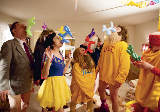 Paul McCarthy WS at the Park Avenue Armory is a big, expensive, puerile, idiotic conceptual art piece that I guess makes the case that most Hollywood movies are big, expensive, puerile, idiotic fairy tales. WS consists of eight hours of film in which McCarthy plays Walt Disney shooting a live action version of Snow White and the Seven Dwarves, with most of the characters sporting prosthetic noses, eating junky food, and cavorting orgiastically with toy-balloon genitals and cake-frosting jizz. The main film sequences are projected onto two banks of screens at either end of the Armory’s cavernous space. In the middle of the space stands a reconstruction of the sets used for the film – a plywood simulation of a suburban tract house and a plastic jungle for the forest sequences. Additional film sequences screen in a series of galleries off to the side.