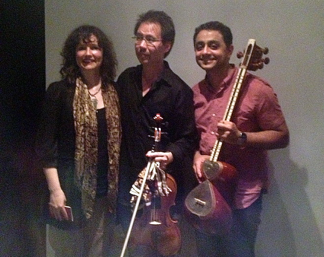 For this occasion, the two of them were joined by tar and setar player Hidayat Honari for a program called “Rokh-e Khåk (رخ خاک),” an hour of classical Persian music – new, old, and improvised tunes with texts taken from the poetry of Hafiz, the 14th century Persian mystic. I know Hafiz’s work mostly from the sly, ecstatic English versions by Robert Bly. It was utterly transporting to hear this trio perform this music and to experience Jessika’s amazing, soulful voice communing with ancient Arabic. Apparently, the three of them all study with the same Persian master. It was a sweltering night, so Eyvind thoughtfully created an intermission after half an hour to turn the air conditioning and fan on for a while before resuming.