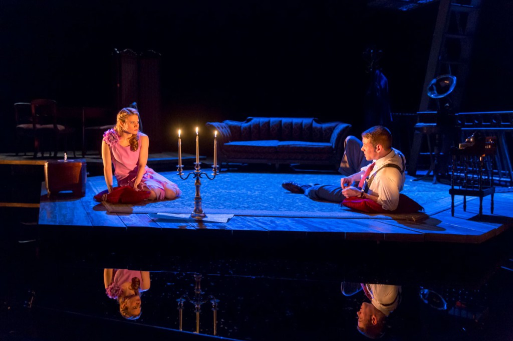 The production concept is strong and remarkable because it doesn’t get in the way of the actors but gives them something extra on their plate, so they go about their business (on a tiny island of tenement surrounded by Crowley’s lake of black goo) a little bit like naturalistic actors but also a little bit like performance artists. I think Tennessee Williams would have approved. His introductory stage directions explicitly state, “The scene is memory and is therefore non-realistic. Memory takes a lot of poetic license. It omits some details; others are exaggerated, according to the emotional value of the articles it touches, for memory is seated predominantly in the heart. The interior is therefore rather dim and poetic.”