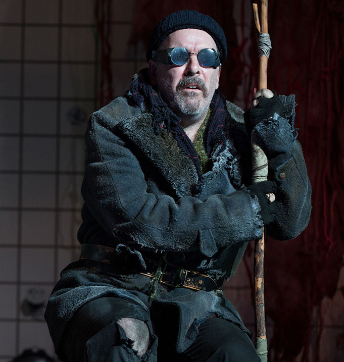 Some moments that interested me: Rea as Oedipus in bloody overalls with goggles full of liquid dripping from his eyes down his cheeks (tears, pus); Rea as king speaking to the Theban populace through a hand-held microphone; Rea as Otto in the wheelchair, an image that echoes Shepard’s play States of Shock; Lloyd Hutchinson playing a somewhat confusing array of commentators – a bones-tossing oracle, blind Tiresias (with shades of Endgame’s Hamm, see above), a guy known as Maniac of the Outskirts – all with blazing eyes and the relish of a great barroom storyteller; handsome Aidan Redmond as a haughty and haunted Laius; Brid Brennan’s Jocasta, making her entrance bizarrely trapped in a revolving cage; and the several passages where Judith Roddy, the lovely young actress ostensibly playing Antigone (see below), sang beautiful tiny scraps of song (composed by cellist Neil Martin who performs live in a sort of balcony/window alongside dobro played Todd Livingston). There’s not a lot about A Particle of Dread that you could point to as an unqualified good show – but every moment of it screams Sam Shepard.
