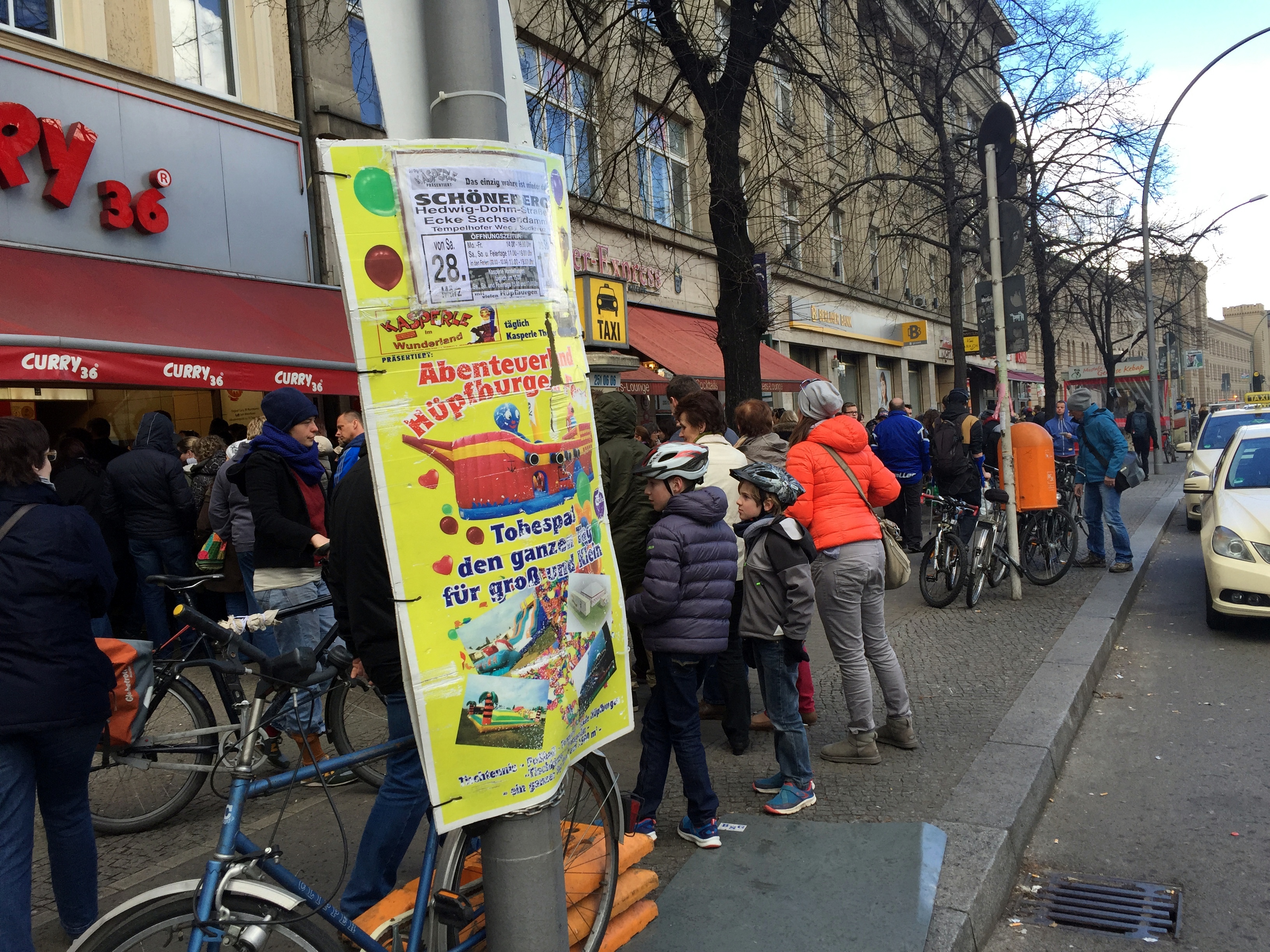 same block, huge crowds for Curry 36, classic Berlin street food (currywurst and pommes frites with mayo)