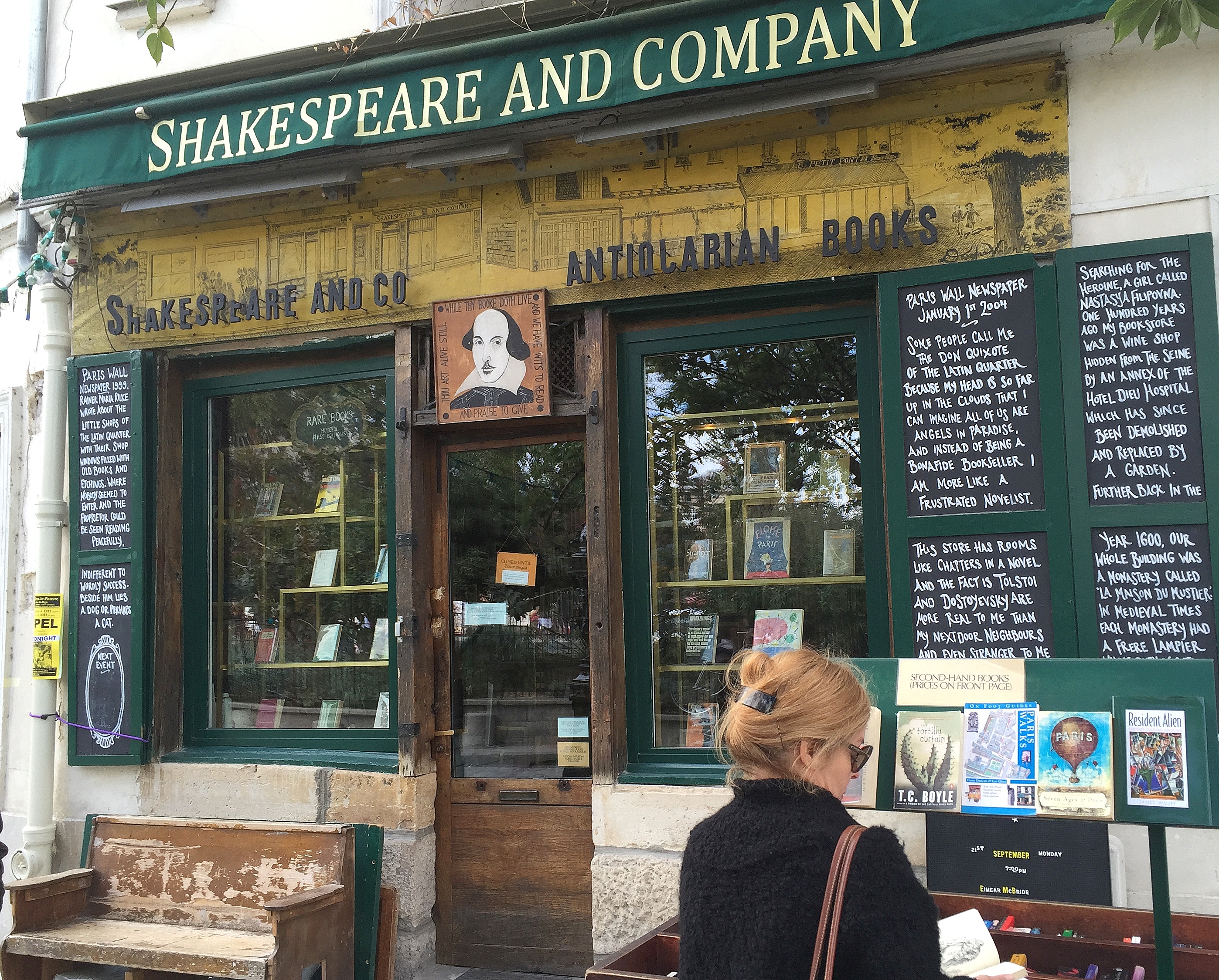 Inside and outside the justifiably legendary bookstore Shakespeare and Company.