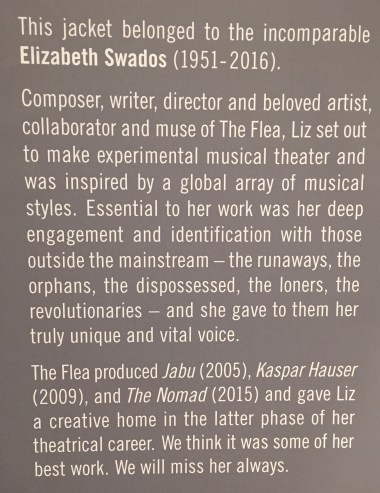 We stopped in for refreshments at the coffee shop Baked on Church Street – I had tea and some little round balls that are the vegan equivalent of doughnut holes – but they closed at 5:00, which left us with a couple of hours to kill. We would have eaten an early supper at the Aussie bistro Two Hands but they also closed at 5, so we ended up happily biding our time at the New Orleans-themed restaurant 1803, where Andy had the pulled pork sandwich and I the Cajun niçoise, both delicious. We got a 15% discount because they have a deal with the Flea Theater, where I was also touched to see Liz Swados’s well-worn leather jacket displayed with suitably fetishistic devotion.