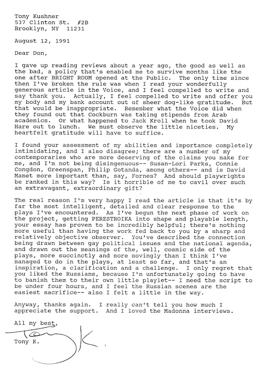 I reviewed David Esbjornson’s bare-bones production for the Village Voice (see here) — I believe it was the first New York review, and I got a very sweet letter from Tony Kushner afterwards.