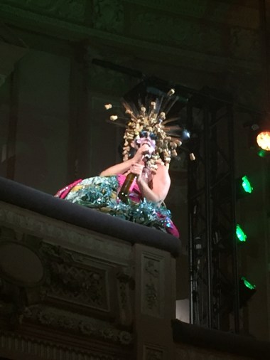 We’d seen one three-hour segment (1956-1986) at St. Ann’s, which contained songs we knew. The early decades turned out to be a hodgepodge of familiar songs queered for Taylor Mac’s purposes and obscurities dug up to illustrate judy’s intersectional historical revision. The show opened with “Amazing Grace,” for which a woman in the audience was selected to come onstage and receive a blessing from the audience. It occasioned the first of many times Taylor Mac said, “This is going to go on a lot longer than you’re going to want it to.”