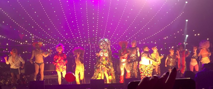 By the end of the night (the last hour was Taylor solo, singing original songs), I was left with a few strong impressions. Fun and crazy and dazzling as the visuals and the jokes were, this was an incredibly impressive and accomplished musical event. Especially when Taylor slowed things down or stood still to sing ballads, they were overwhelmingly beautiful and emotional, along a fascinating unpredictable spectrum — the country ballad “Ghost Riders in the Sky,” Bob Dylan’s “A Hard Rain’s Gonna Fall,” Patti Smith’s “Birdland.” And I walked away blessed to have inhabited a day in the life of a Temporary Queer Utopia, which is as strong a political statement as an artist can make these days.
