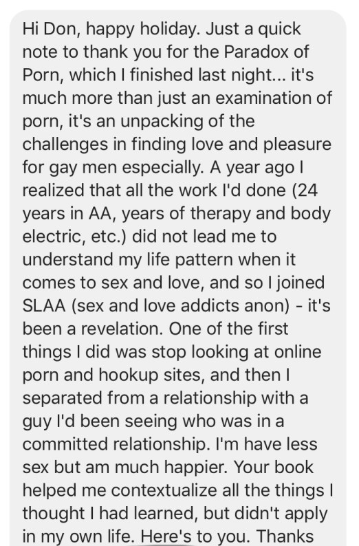 December 28, 2018I’m delighted and grateful that I continue to receive unsolicited positive feedback from strangers, clients, and colleagues whose lives have been affected by reading THE PARADOX OF PORN.