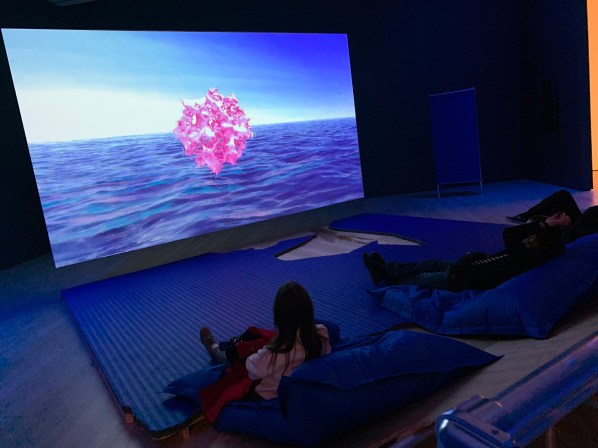 It was the end of the day, so I only had time to stroll through “Surrounds: 11 Installations” on the top floor, pausing to inspect Janet Cardiff & George Bures Miller’s The Killing Machine (above) and Hito Steyerl’s Liquidity Inc. (below).