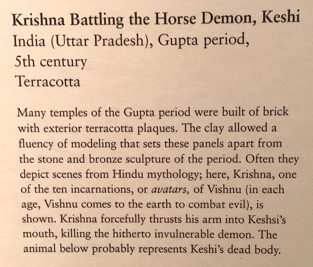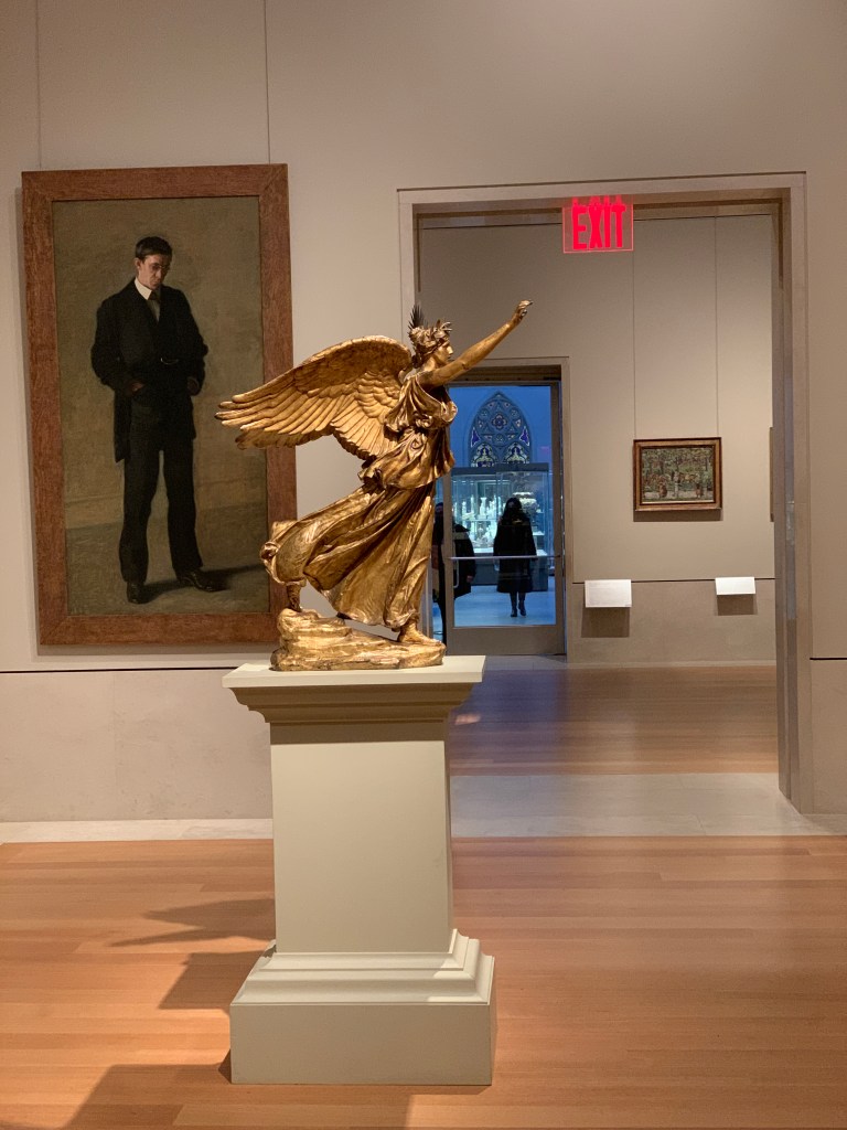 European paintings. Gold figures pointing. Japanese sculpture. Islamic calligraphy.