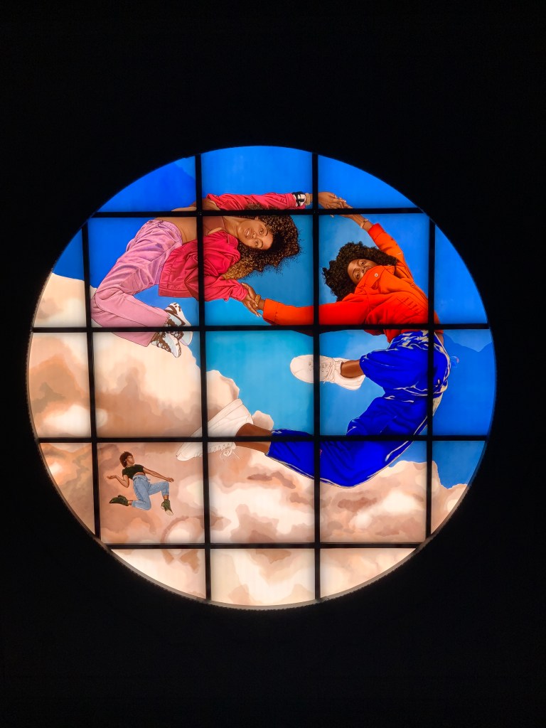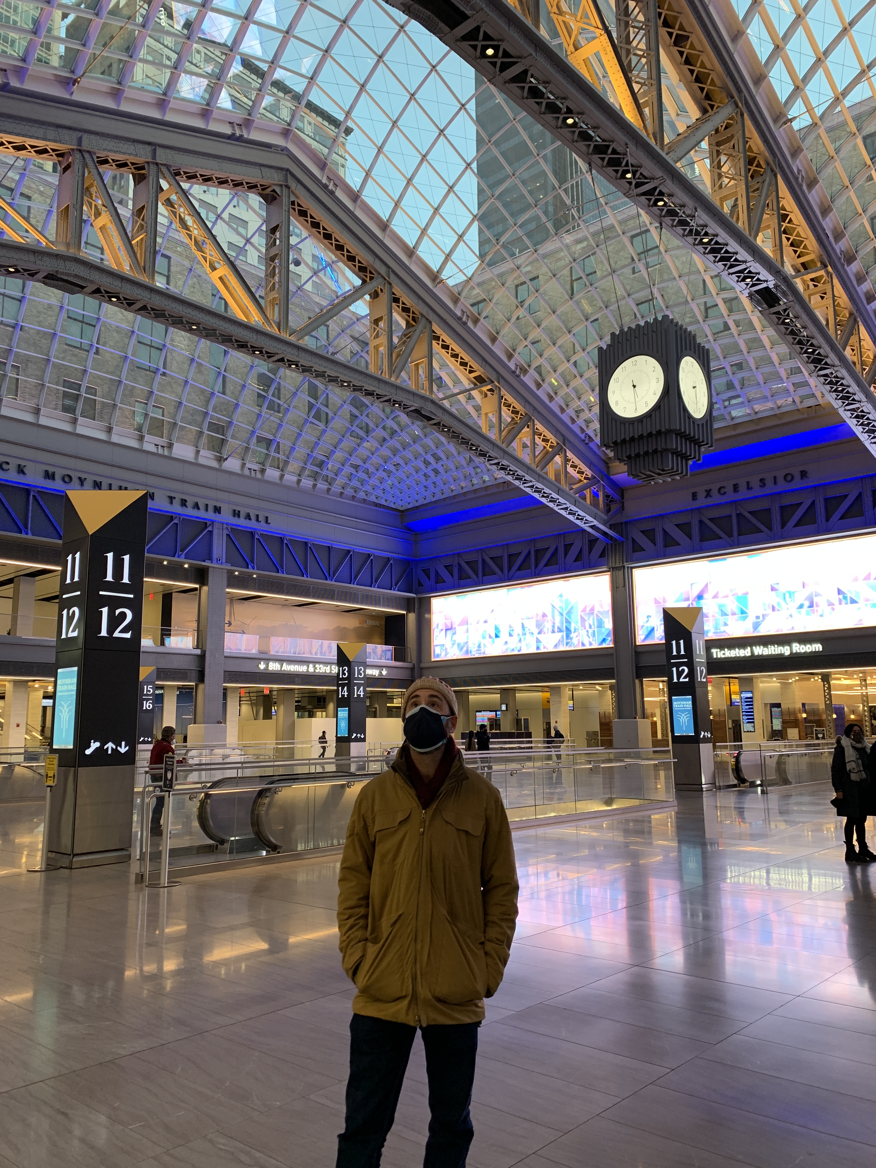 We had two more predetermined destinations. One was the new Daniel Moynihan Train Hall, with its gleaming interiors (currently sparsely populated of course, but envisioned to be teeming with commuters sometime), spectacular skylights, and all kinds of artwork including this colorful three-part stained-glass piece by Kehinde Wiley called “Go” on the ceiling of the 35th Street entrance.