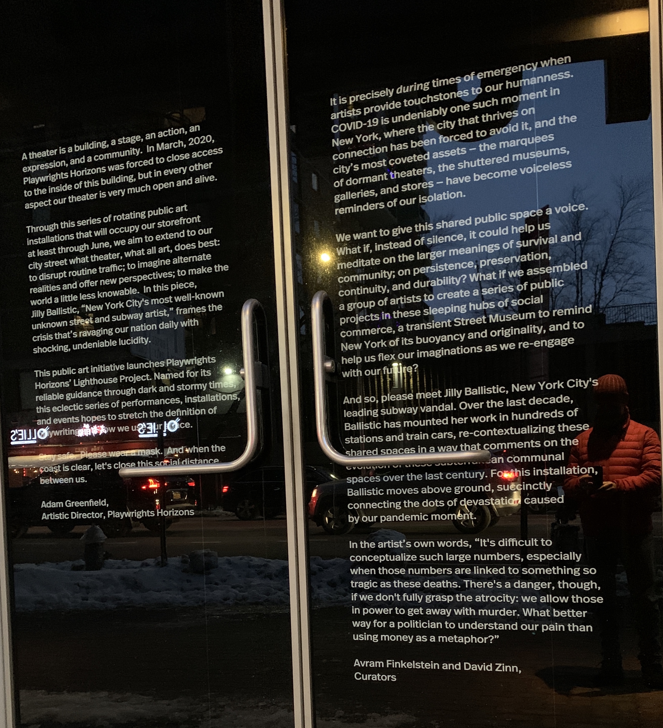 Our final art destination was the storefront for Playwrights Horizons, one of NYC’s great Off-Broadway theaters. It’s been shuttered since last March, like all theaters in the city, but incoming artistic director Adam Greenfield enlisted our friend David Zinn, the Tony Award-winning set and costume designer, and Avram Finkelstein, one of the founders of the AIDS-era art collective Gran Fury, to curate a lively public art project keeping the block activated.