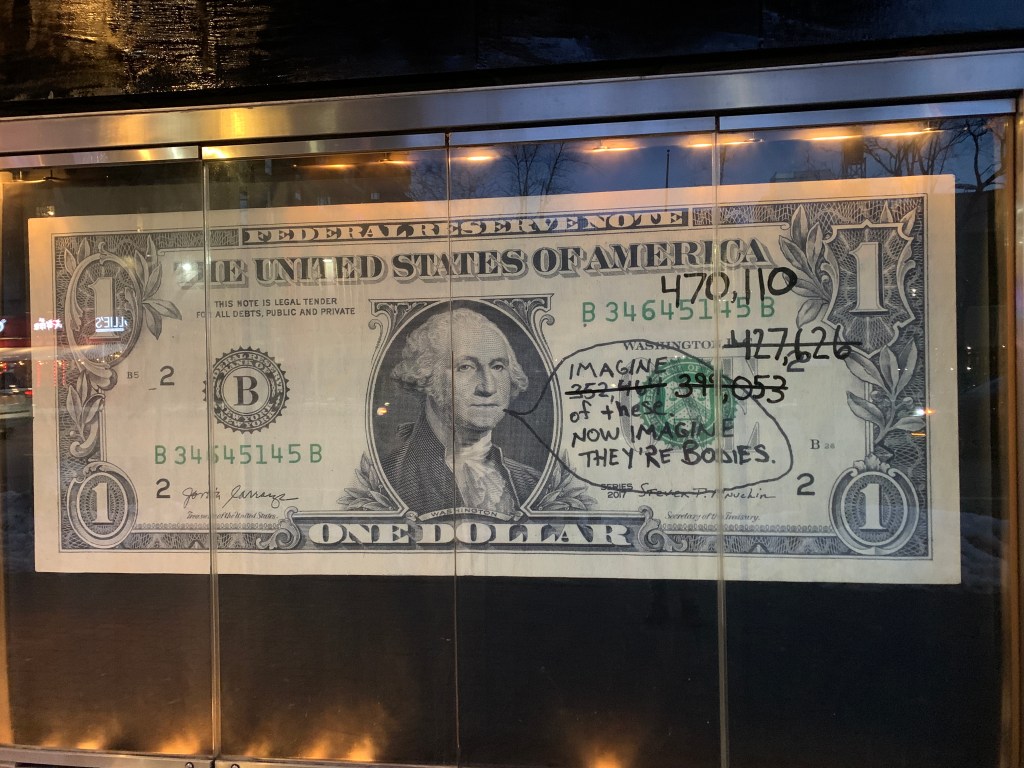The first artist they commissioned was Jilly Ballistic, who created a gigantic mural in the form of a dollar bill regularly updated with a reference to the number of Americans who have died of covid-19.