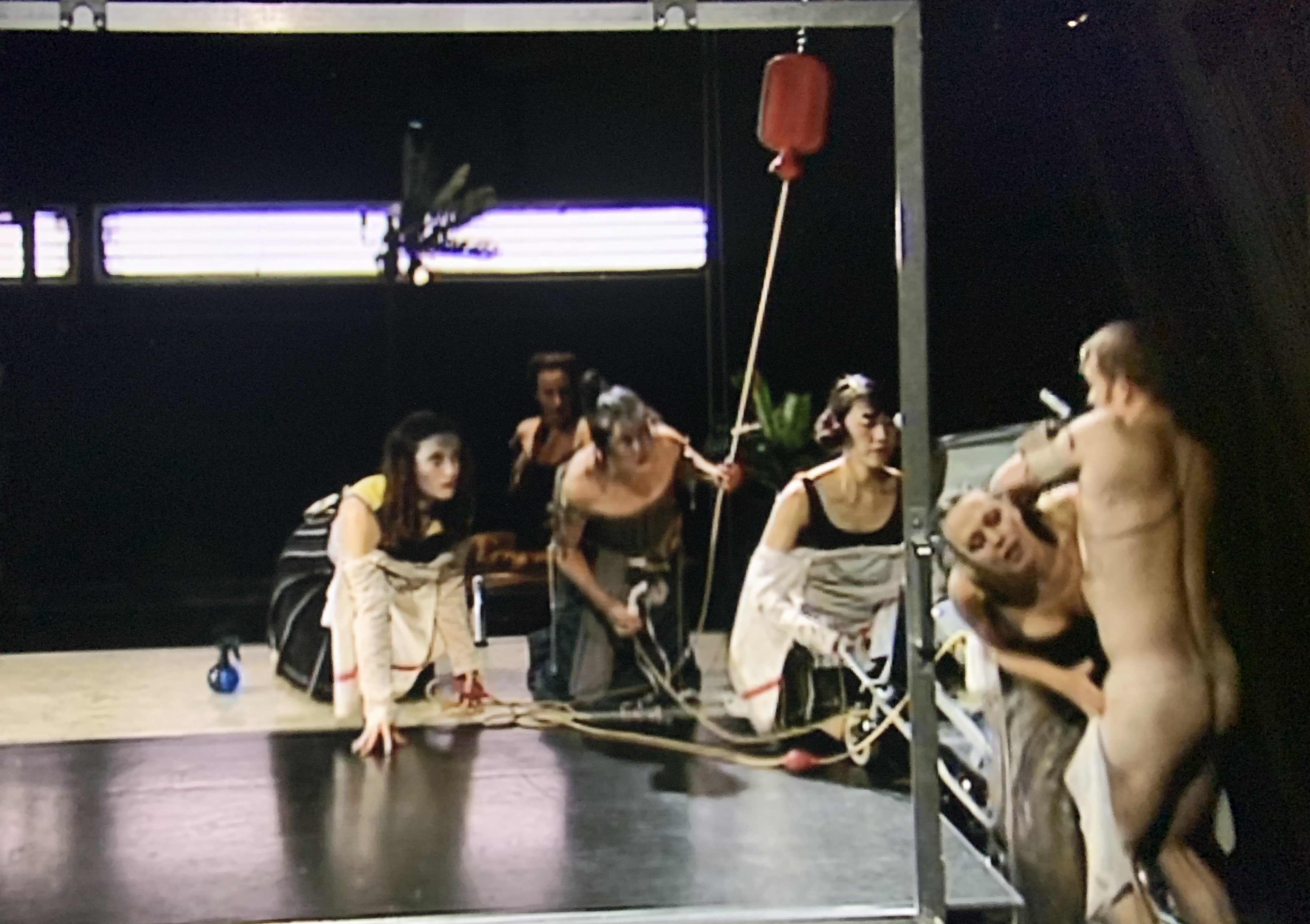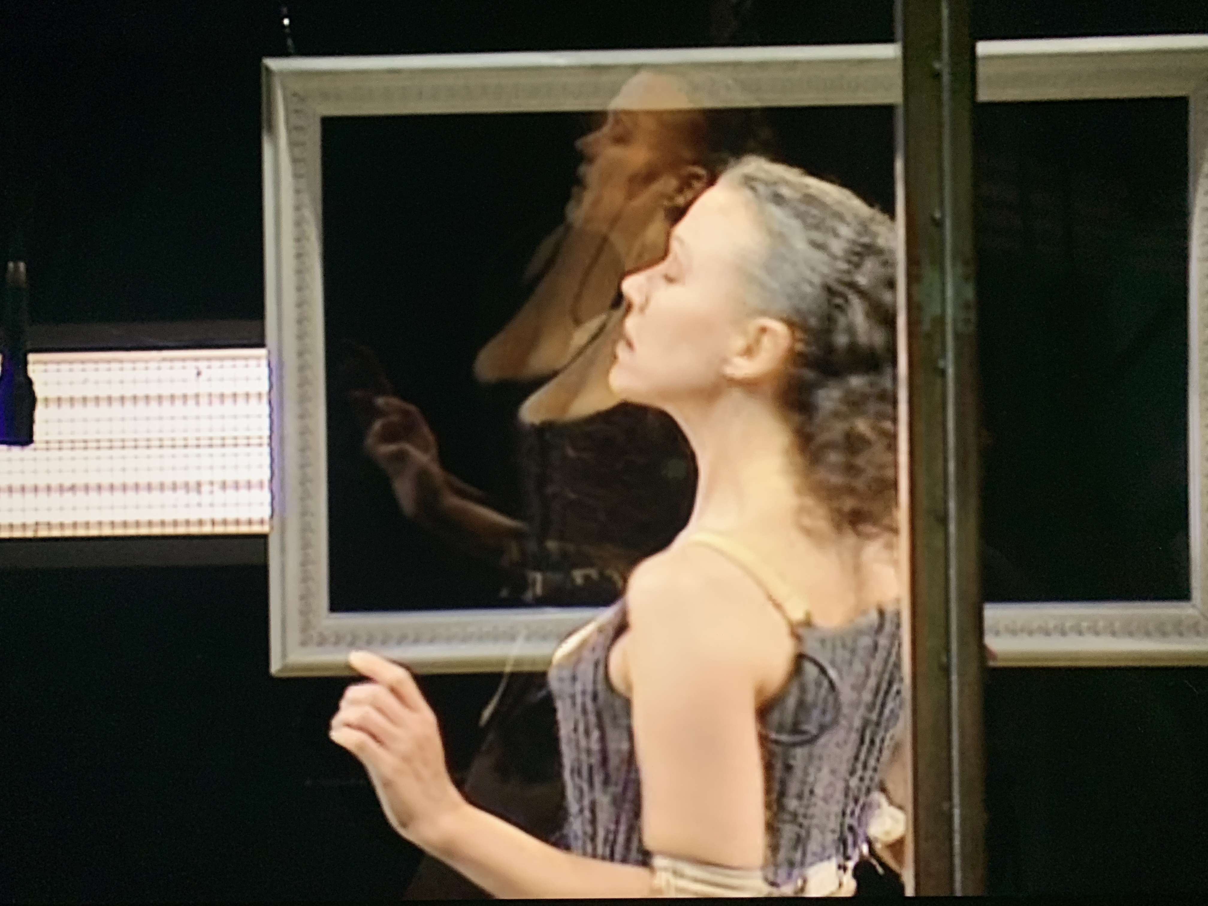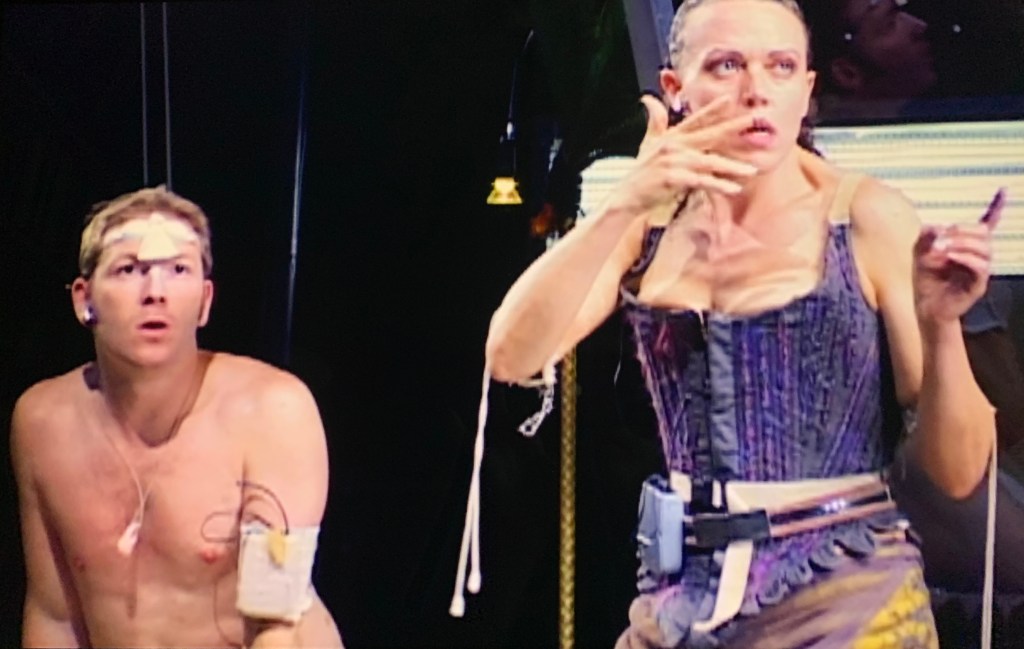 After watching the video, I got inspired to haul out Andrew Quick’s fantastic 2007 scholarly volume, The Wooster Group Work Book, for which he pored through all the rehearsal tapes and written notes for five Wooster Group productions. I thought I’d devoured the whole book when it came out, but I discovered that I’d read all but the last section about To You, the Birdie! So I had the delightful experience of reading all the documentation and Quick’s interviews with Liz and Kate having just watched the show again. I’d heard that the project originated from Kate’s desire to play a queen, having played any number of maids and functionaries in Wooster Group productions. She brought in Schmidt’s version of Phèdre and the actors read it aloud, but Liz found the text boring and struggled to find a way to make it come alive, which only happened when they borrowed from Japanese theater the idea of one performer (Kate) playing the physical character while another (Scott) gave the vocal performance. Hearing a male voice speaking Phèdre’s lines reminded Liz of Paul Schmidt, so in some way the production developed as a tribute to him. (Schmidt died in 1999 of AIDS at the age of 65.)