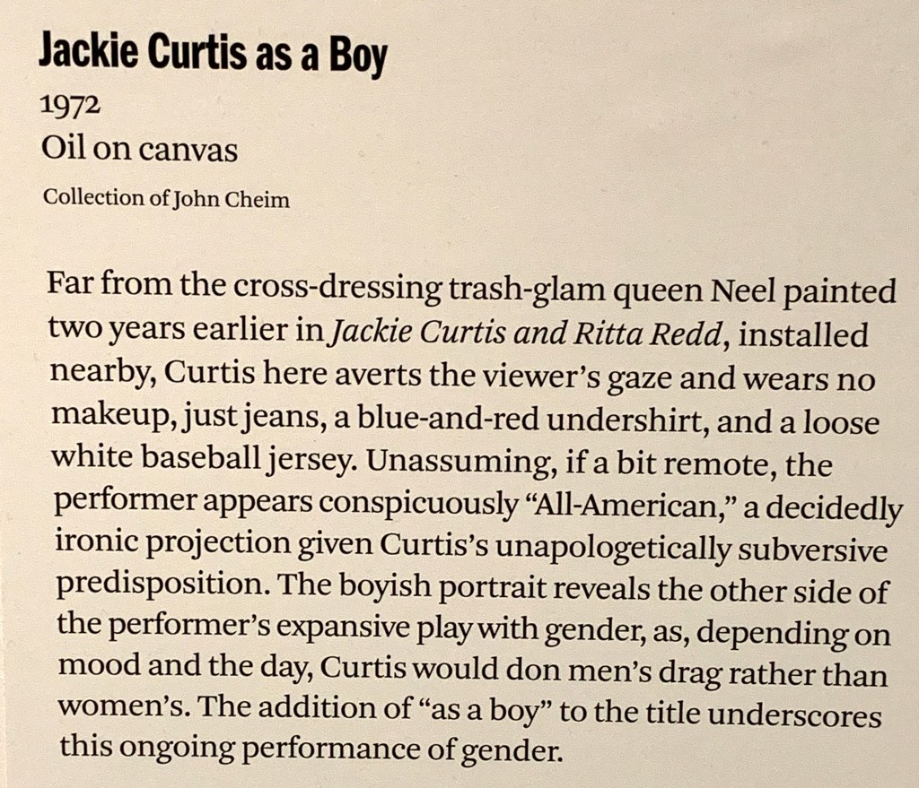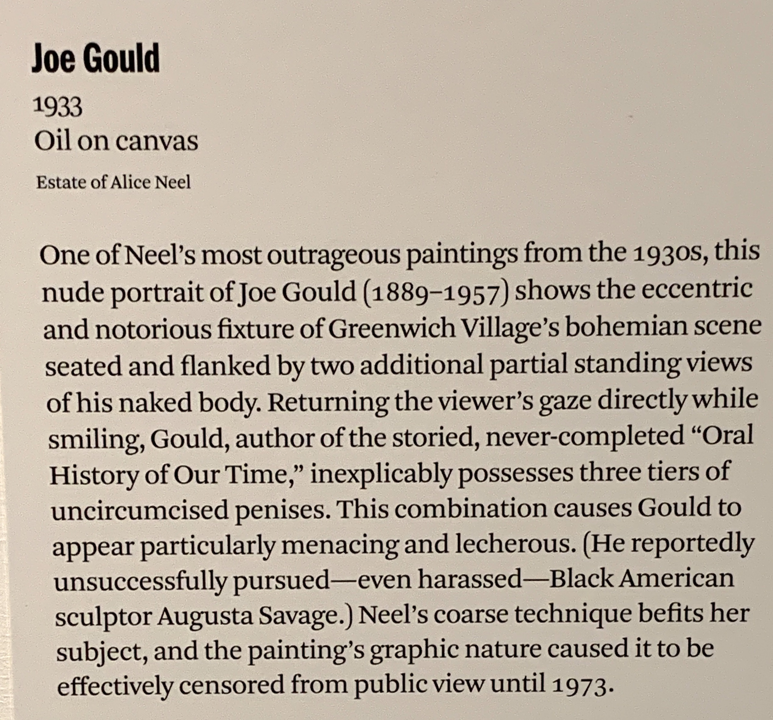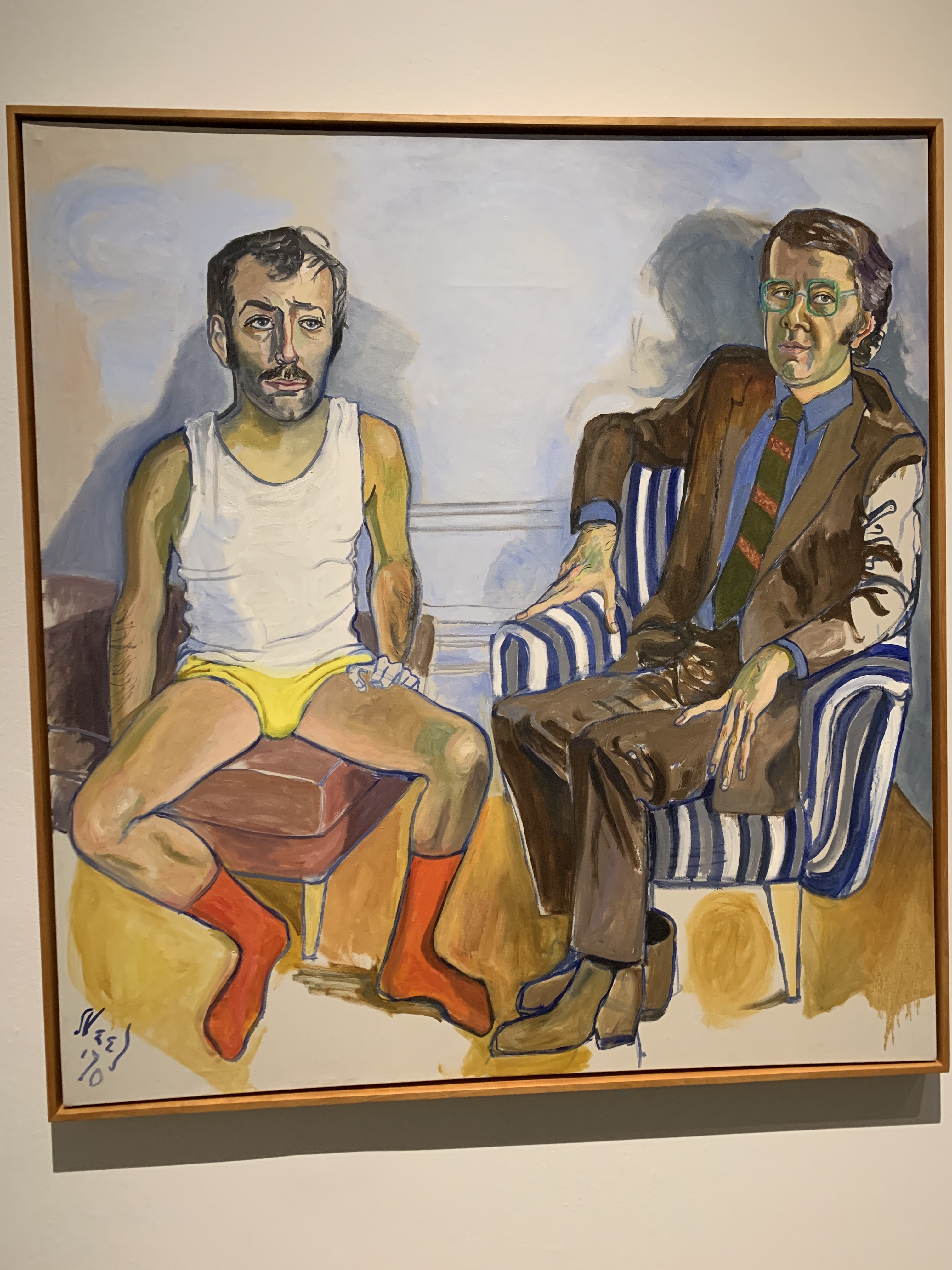 Alice Neel is a name I’ve long been familiar with but, like most people, I suspect, I had no specific file on her painting until the Metropolitan Museum mounted its spectacular show of her work, “People Come First.” We finally got around to seeing it a week before it closed. I love the amazing cross-section of New Yorkers she painted, with a big focus on bohemian life, working people, queer artists, and casually explicit sexuality. Others have written more eloquently and more knowledgeably about the work in this exhibition. I’m just going to share a few of the pictures that called out to me.