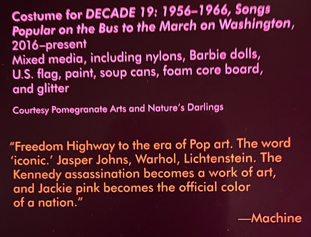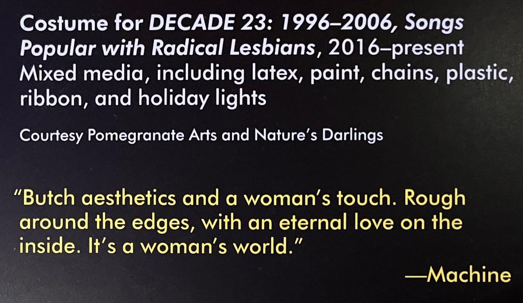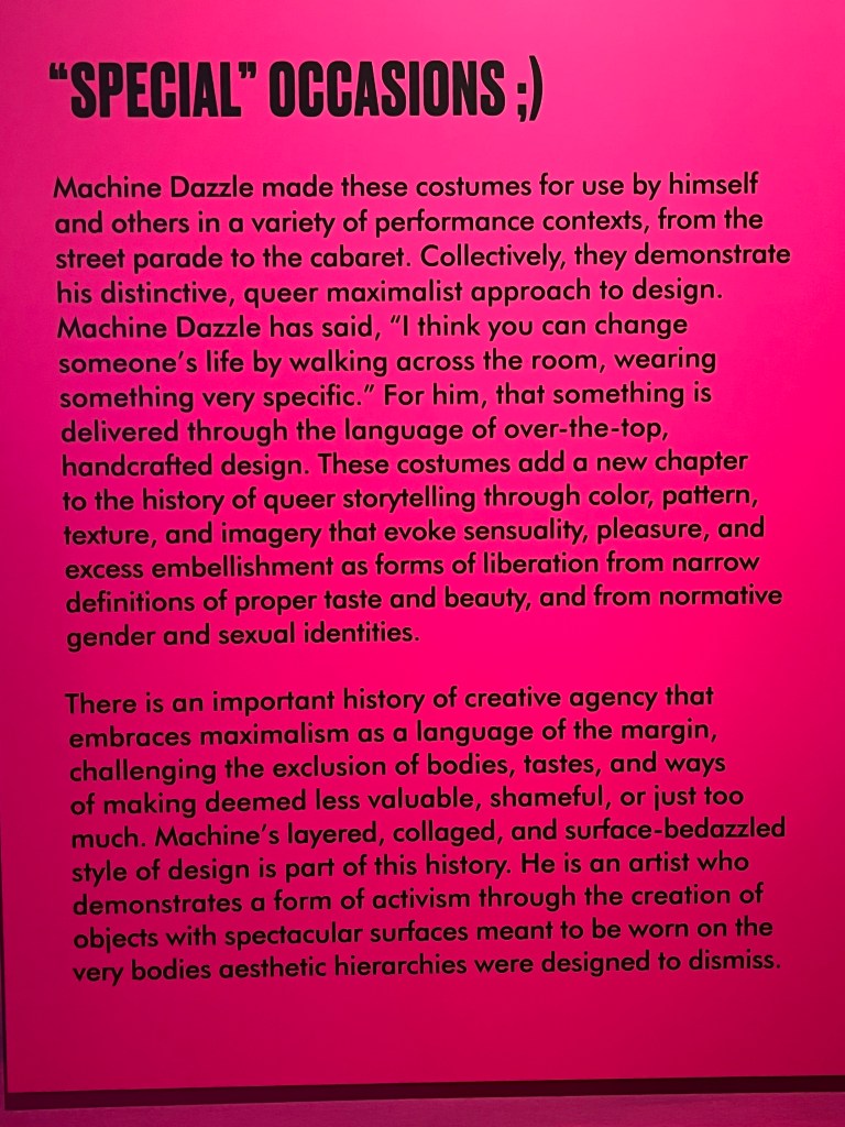 Saturday: Our friend Allen was visiting from San Francisco so Saturday afternoon we took him to the Museum of Art and Design and introduced him to the genius that is Machine Dazzle, who gets two whole floors to display his “Queer Maximalism.” The fifth floor showcases some of the mind-boggling outfits Machine created for Taylor Mac’s “24-Decade History of Popular Music.”