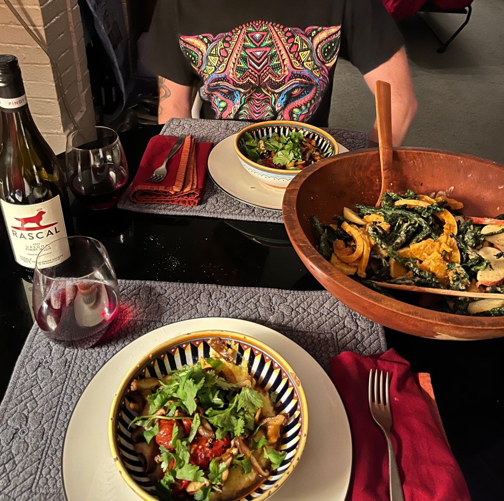 Sunday afternoon we trekked down to the East Village to see The Boy and the Heron, Hayao Miyazaki’s valedictory film, a beautiful and trippy fantastic-voyage mythological yarn full of tiny references to characters and images from the Studio Ghibli pantheon. We came home and I made two fairly ambitious dishes from the New York Times Cooking app – a kale and squash salad with almond-butter vinaigrette (per Ali Slagle) and spicy roasted mushrooms with polenta (thank you, Yotam Ottolenghi!).