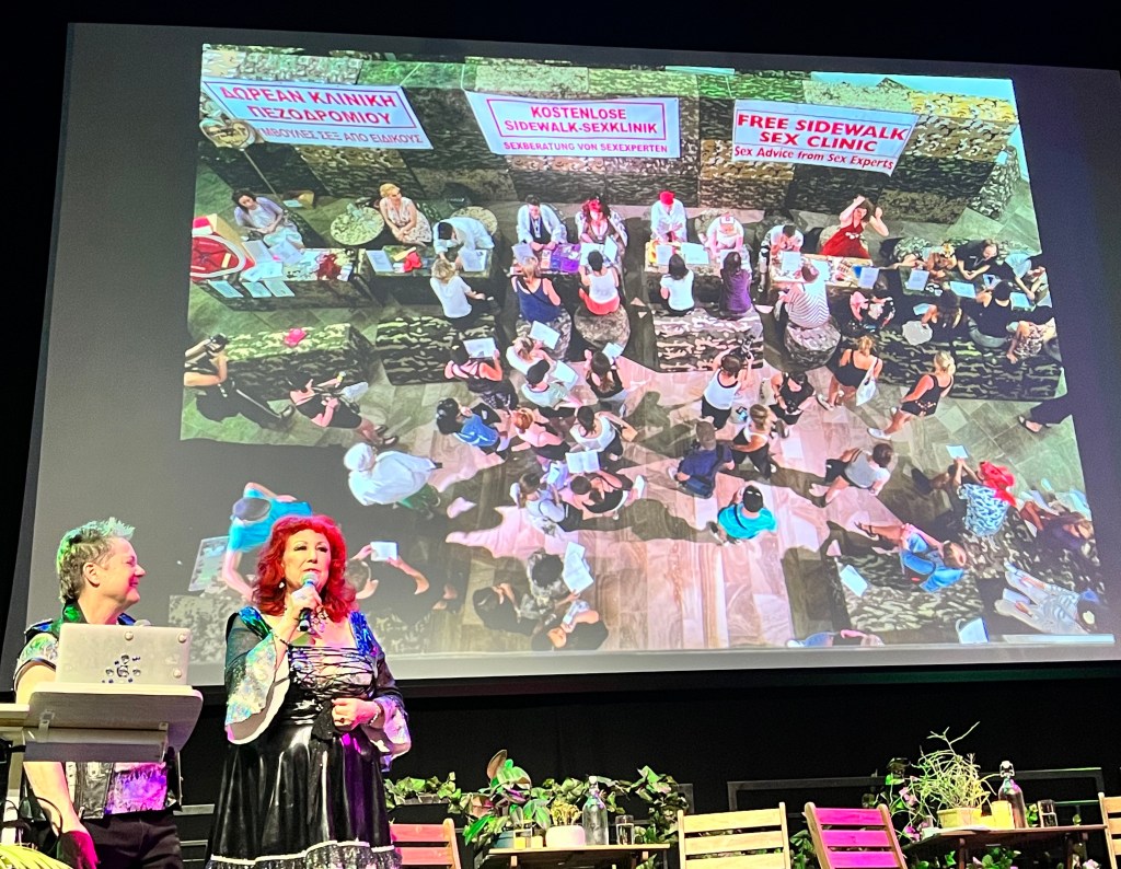 Playfulness permeates the language they use. To heal the world, Annie said more than once during the festivities, “It takes a brothel!” Annie of course came to fame in the 1970s as a porn star and sex worker and then evolved into a performance artist and sex educator whose cartoony persona allowed her to smuggle cutting-edge queer/feminist sensibility into an increasingly wider world. She and Beth, whom she met in 2002, identify as “eco-sexual,” meaning “The earth is our lover.” They were married to the earth by shamanic performance artist Guillermo Gomez-Peña, and it’s not a platonic love affair. They get down in the actual dirt, they made a beautiful film called Water Makes Me Wet, they’re working on a new movie called Playing With Fire, and they published a book called Assuming the Ecosexual Position. They model getting very personal and political about saving the planet. But they’re not fundamentalist about it – you can be “eco-romantic” or, if you’re still trying to figure out your entry point to environmental activism, you can be “eco-curious.” Submit to the “eco-sexual gaze”! Find your “e-spot”! Rub up against oaks and call it “Treebadism”!