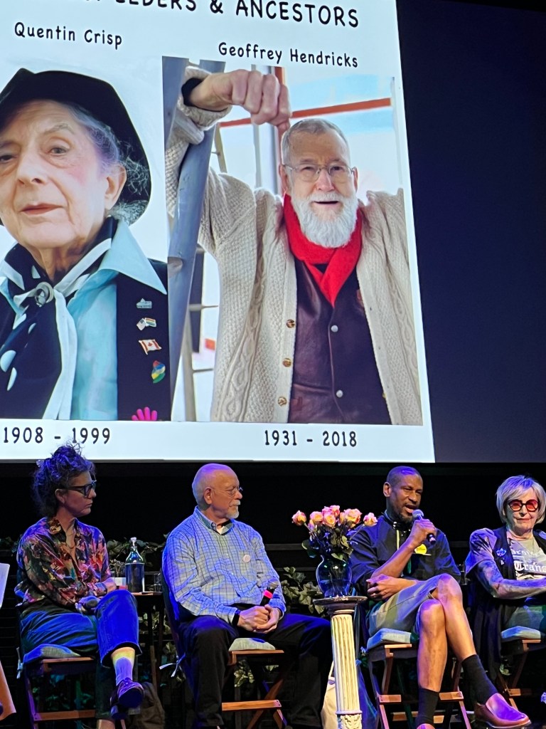 Savitri D. spoke about the value of being connected to a place, while video showed a gigantic tree being cut down limb-by-limb in NYC. Sur Rodney (Sur) and Philip Ward spoke about the sacred task of maintaining the archives of departed artists (Fluxus member Geoff Hendricks and writer-performer Quentin Crisp), constantly having to distinguish sentimental value from historical value.