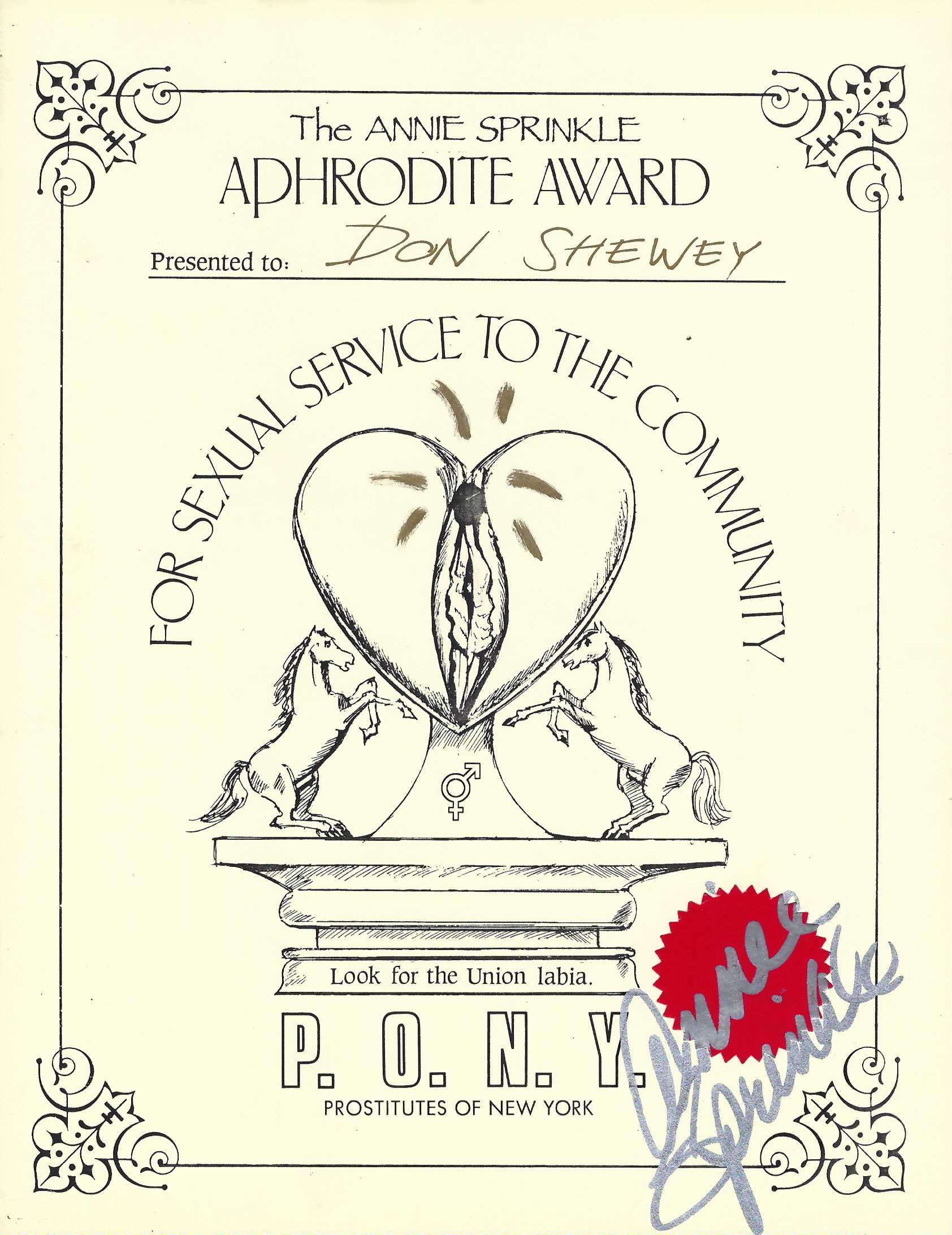 And one of my prize possessions is the Annie Sprinkle Aphrodite Award “for sexual service to the community,” given to participants in Joseph Kramer’s sacred intimate training in 1992.