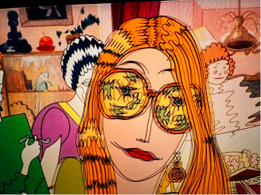 Best Films: I didn’t see a lot of blockbusters. Barbie, of course, and Oppenheimer, but neither of them blew me away as much as the wildly underrated Spider-Man: Across the Spider-Verse. I admired documentaries galore: The Disappearance of Shere Hite, All the Beauty and the Bloodshed, Navalny, Leaning into the Wind – Andy Goldsworthy, 32 Sounds.But my movie-watching this year largely revolved around my MUBI subscription, which got me to see tons of quirky vintage foreign films (the 1980 Hungarian animated feature Bubble Bath, below) and fascinating indie gems I otherwise would have missed, many of them international films directed by women. Some favorites: Rotting in the Sun, Kokomo City, The Five Devils, The Sweet East, Ava, Fremont, Amanda, Joyland, Tori and Lokita.