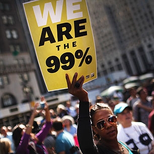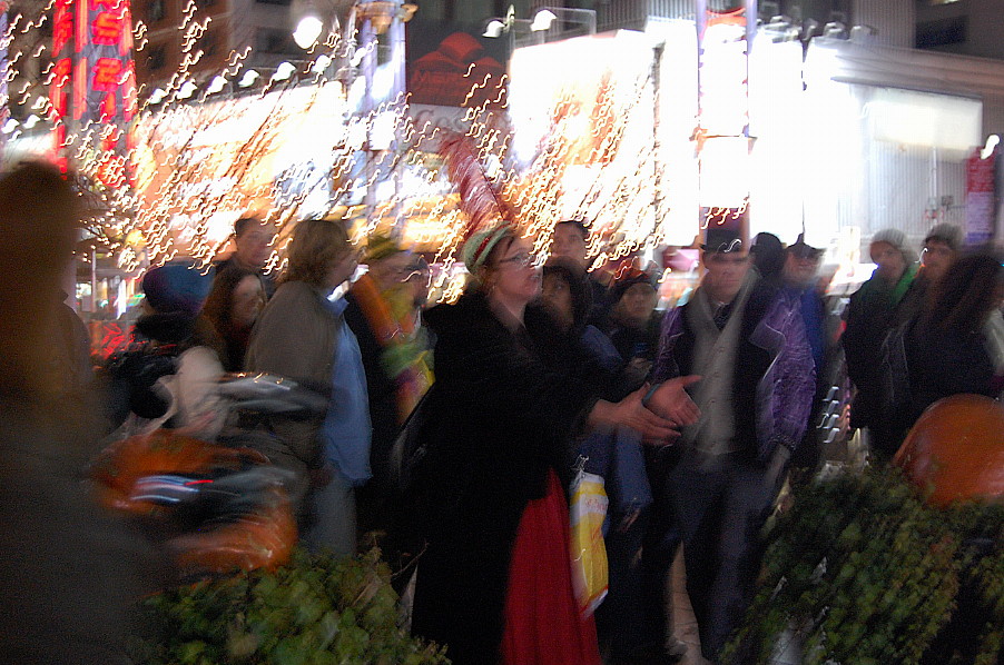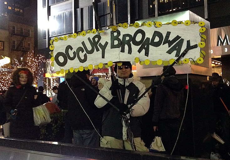 The action took place in the open area between 50th and 51st Streets on Broadway, which had been dubbed the People’s Performance Plaza for the occasion I showed up in time to catch the last half-hour. When I arrived, an a cappella chorus of rather good singers was belting out a song on the theme of “We Are the 99 PerCent.” They were apparently the last in a long string of music, dance, and spoken-word performances that played to anywhere from a couple of dozen (in the middle of the chilly night) to a several hundred (during the day).
