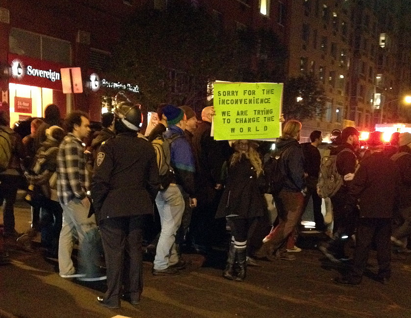 A well-spoken young woman in a long red dress seemed to be facilitating things at this point, and she invited the crowd to form a circle around the plaza holding hands. She said there had been a request for some chanting. Spontaneously, someone called out “All night, all day/Occupy Broadway!” We all chanted that for a while, and the tall guy next to me improvised a Rockette-style kick to go with it, which the entire circle adopted. Then there were a few minutes of “Our movement is unstoppable!/Another world is possible!”
