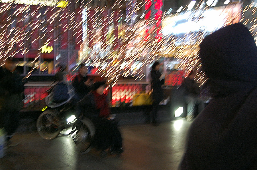 Next Red Dress Lady proposed that we break up into small groups and have a conversation about our experience with Occupy Broadway. My group consisted of Patrick, a longtime Occupier whose group Gravity performed at 1:00 AM; two Chinese-American brothers, Kevin and James; and a woman named Rebecca. People who only know of Occupy Wall Street from reading or watching news accounts of clashes with police might be surprised at how intimate and communal these actions are. Call it new age-y or call it civilized, it prompts strangers to talk to each other, on whatever shallow or deep level they choose. The diversity of OWS supporters delights me — from Radical Faeries (above) to multiple people in motorized wheelchairs (below).