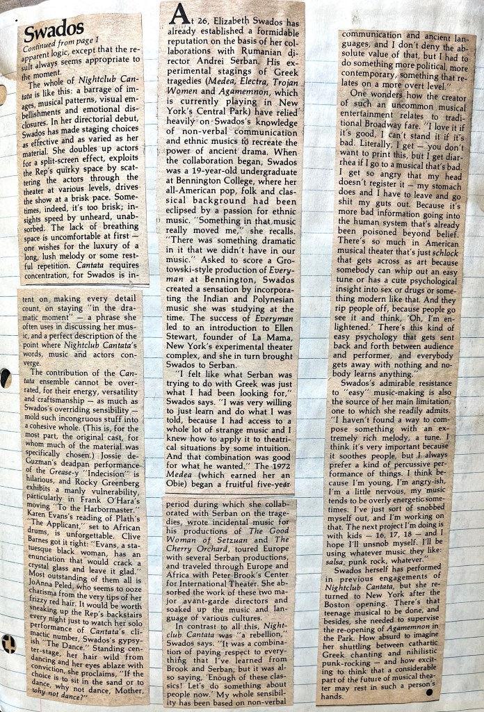 In contrast to all this, Nightclub Cantata was “a rebellion,” Swados says. “It was a combination of paying respect to everything that I’ve learned from Brook and Serban, but it was also saying, ‘Enough of these classics! Let’s do something about people now.’ My whole sensibility has been based on non-verbal communication and ancient languages, and I don’t deny the absolute value of that, but I had to do something more political, more contemporary, something that relates on a more overt level.”