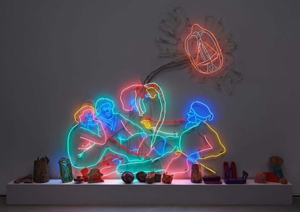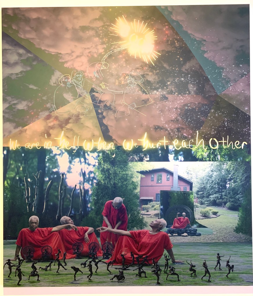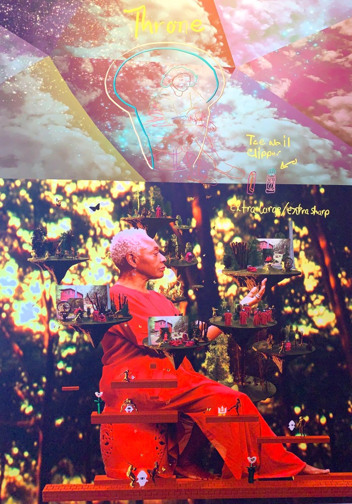I felt indifferent to most of Taylor’s unbeautiful paintings, though I thought his room of portraits of artists was witty (Tyler the Creator on a suitcase, above; Deena Lawson “in the Lionel Hamptons,” below) and his installation dedicated to the uniforms of the Black Panthers arresting.