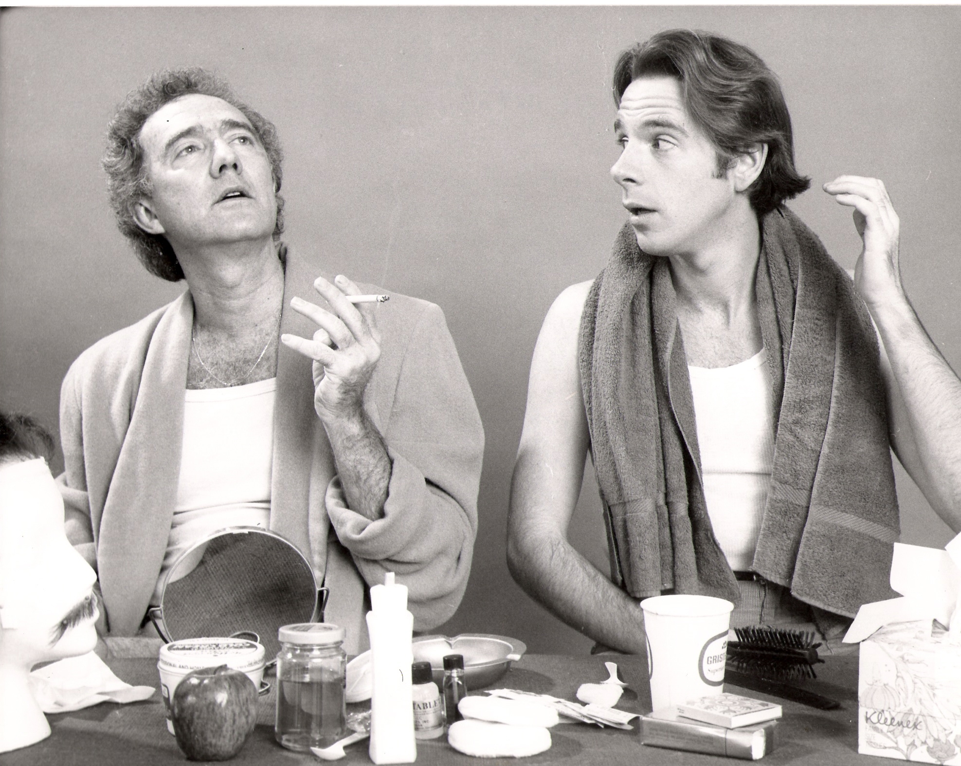 As with David Mamet (see above), Shepard has a certain formula that he returns to repeatedly. His writing has virtually always been a dialogue with himself. At the center of many, many, many of his plays are two guys bantering – True West is the best-known, and a perfect example of one male ego split into two parts, one sort of polite and erudite, the other ornery and given to bursts of macho violence that would be tired clichés if they weren’t so comically lame. Ages of the Moon harks back to Shepard’s very earliest plays, Cowboys and Rock Garden (his first double-bill in New York City), both two-handers, but forwarded now to middle age. All of Shepard’s writing these days (including his prose, like the new collection Days Out of Days, which Walter Kirn reviews on the front page of today’s Sunday NY Times Book Review) chronicles the restlessness of his soul, barely acknowledging his 30-year relationship with Lange and his movie stardom (he’s made 50 movies, most recently playing Jake Gyllenhaal and Tobey Maguire’s father in Brothers) but reflecting his incessant cross-country drinking, driving, and guilty womanizing. Ages of the Moon begins, like any number of Shepard’s plays, with the main character, Ames (Rea), having summoned his best buddy, Byron (Sean McGinley), to his side to commiserate over the latest, always seemingly irreconcilable blowout with his woman. This time she found scribbled on his fisherman’s map a woman’s name and phone number, a woman Ames can barely remember and would never ever think of calling up “even for a minor blowjob.”