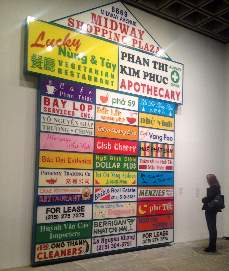 Another piece I liked very much was Ken Lum‘s piece slyly replicating the signage at a mundane urban shopping center with references to the Vietnam War: